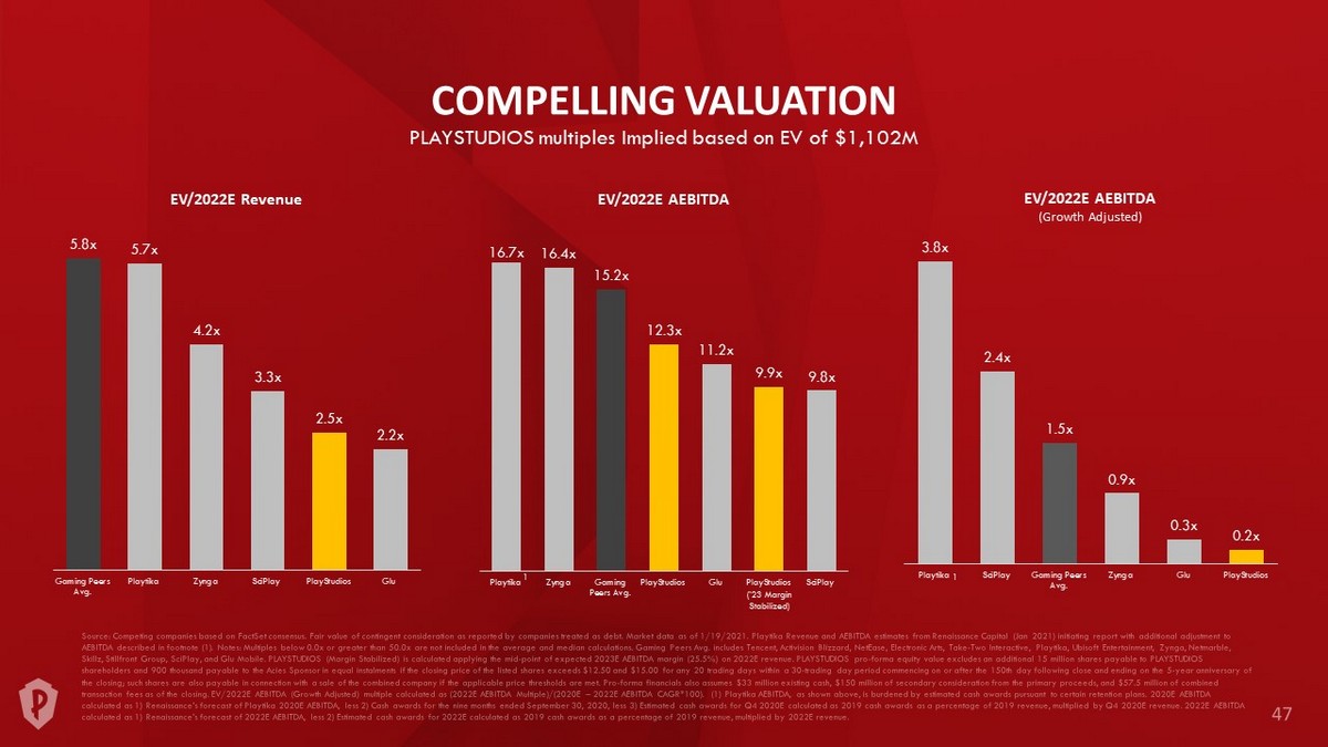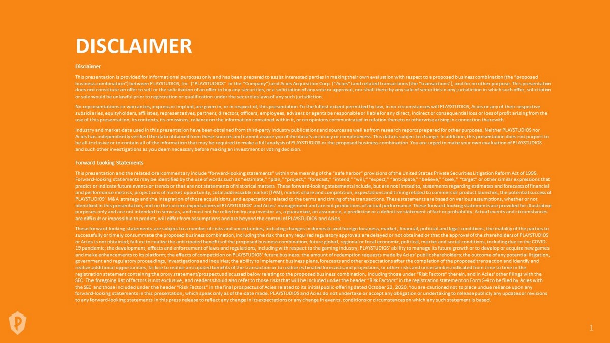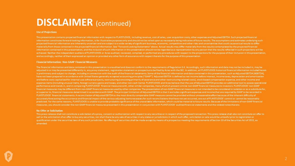 DISCLAIMER (continued) Use of Projections This presentation contains projected financial information with respect to PLAYSTUDIOS, including revenue, cost of sales, use r a cquisition costs, other expenses and Adjusted EBITDA. Such projected financial information constitutes forward - looking information, is for illustrative purposes only and should not be relied upon as necessar ily being indicative of future results. The assumptions and estimates underlying such projected financial information are inherently uncertain and are subject to a wide variety of significant business, economic, co mpetitive and other risks and uncertainties that could cause actual results to differ materially from those contained in the projected financial information. See “Forward - Looking Statements” above. Actual results m ay differ materially from the results contemplated by the projected financial information contained in this presentation, and the inclusion of such information in this presentation should not be regarded as a representation by any person that the results reflected in such projections will be achieved. Neither the independent auditors of PLAYSTUDIOS or Acies audited, reviewed, compiled, or performed any procedures with respect to the projections for the purpose of their inclusion i n this presentation, and accordingly, neither of them expressed an opinion or provided any other form of assurance with respect thereto for the pu rpo se of this presentation. Financial Information; Non - GAAP Financial Measures The financial information and data contained in this presentation is unaudited and does not conform to the requirements of Re gul ation S - X. Accordingly, such information and data may not be included in, may be adjusted in or may be presented differently in, any proxy statement, registration statement or prospectus to be filed by Acies with the SEC. In addition, all PLAYSTUDIOS historical financial information included herein is preliminary and subject to change, including in connection with the audit of the financial statements. Some of the financi al information and data contained in this presentation, such as Adjusted EBITDA (AEBITDA), have not been prepared in accordance with United States generally accepted accounting principles (“GAAP”). Adjusted EBITDA is de fined as net income before interest, income taxes, depreciation and amortization and before costs capitalized for internal - use software projects, restructuring (consisting primarily of severance and other rest ructuring related costs), stock - based compensation expense, and other income and expense items (including unusual items, foreign currency gains and losses, and other non - cash items). PLAYSTUDIOS and Acies believe that the use of Adjusted EBITDA provides an additional tool to assess operational performance and trends in, and in comparing PLAYSTUDIOS’ financial measures with, other similar companies, many of which pres ent similar non - GAAP financial measures to investors. PLAYSTUDIOS’ non - GAAP financial measures may be different from non - GAAP financial measures used by other companies. The presentation of non - GAAP finan cial measures is not intended to be considered in isolation or as a substitute for, or superior to, financial measures determined in accordance with GAAP. The principal limitation of Adjusted EBITDA is that it ex cludes significant expenses and income that are required by GAAP to be recorded in PLAYSTUDIOS’ financial statements. A reconciliation of Adjusted EBITDA to the most directly comparable GAAP measure cannot be pr ovided without unreasonable effort because of the inherent difficulty of accurately forecasting the occurrence and financial impact of the various adjusting items necessary for such reconciliations tha t have not yet occurred, are out of PLAYSTUDIOS’ control or cannot be reasonably predicted. For the same reasons, PLAYSTUDIOS is unable to provide probable significance of the unavailable information, which co uld be material to future results. Because of the limitations of non - GAAP financial measures, you should consider the non - GAAP financial measures presented in this presentation in conjunction with PLAYSTUDIOS’ au dited financial statements and the related notes thereto. No Offer or Solicitation This press release shall not constitute a solicitation of a proxy, consent or authorization with respect to any securities or in respect of the proposed transaction. This press release shall also not constitute an offer to sell or the solicitation of an offer to buy any securities, nor shall there be any sale of securities in any states or jurisd ict ions in which such offer, solicitation or sale would be unlawful prior to registration or qualification under the securities laws of any such jurisdiction. No offering of securities shall be made except by means of a p rospectus meeting the requirements of Section 10 of the Securities Act of 1933, as amended.