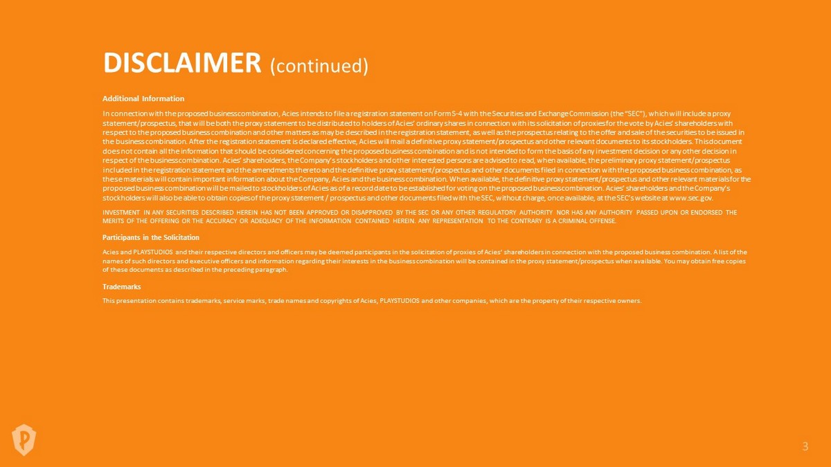DISCLAIMER (continued) Additional Information In connection with the proposed business combination, Acies intends to file a registration statement on Form S - 4 with the Securities and Exchange Commission (the “SEC”), which will includ e a proxy statement/prospectus, that will be both the proxy statement to be distributed to holders of Acies ’ ordinary shares in connection with its solicitation of proxies for the vote by Acies ’ shareholders with respect to the proposed business combination and other matters as may be described in the registration statement, as well as the prospectus relating to the offer and sale of the securities to be issued in the business combination. After the registration statement is declared effective, Acies will mail a definitive proxy statement/prospectus and other relevant documents to its stockholders. This document does not contain all the information that should be considered concerning the proposed business combination and is not intend ed to form the basis of any investment decision or any other decision in respect of the business combination. Acies ’ shareholders, the Company’s stockholders and other interested persons are advised to read, when available, the preliminary pro xy statement/prospectus included in the registration statement and the amendments thereto and the definitive proxy statement/prospectus and other doc ume nts filed in connection with the proposed business combination, as these materials will contain important information about the Company, Acies and the business combination. When available, the definitive proxy statement/prospectus and other relevant materials for the proposed business combination will be mailed to stockholders of Acies as of a record date to be established for voting on the proposed business combination. Acies ’ shareholders and the Company’s stockholders will also be able to obtain copies of the proxy statement / prospectus and other documents filed with the SEC, w ith out charge, once available, at the SEC’s website at www.sec.gov . INVESTMENT IN ANY SECURITIES DESCRIBED HEREIN HAS NOT BEEN APPROVED OR DISAPPROVED BY THE SEC OR ANY OTHER REGULATORY AUTHORI TY NOR HAS ANY AUTHORITY PASSED UPON OR ENDORSED THE MERITS OF THE OFFERING OR THE ACCURACY OR ADEQUACY OF THE INFORMATION CONTAINED HEREIN. ANY REPRESENTATION TO THE CONTRARY IS A CRIMINAL OFFENSE. Participants in the Solicitation Acies and PLAYSTUDIOS and their respective directors and officers may be deemed participants in the solicitation of proxies of Acies ’ shareholders in connection with the proposed business combination. A list of the names of such directors and executive officers and information regarding their interests in the business combination will be con tained in the proxy statement/prospectus when available. You may obtain free copies of these documents as described in the preceding paragraph. Trademarks This presentation contains trademarks, service marks, trade names and copyrights of Acies , PLAYSTUDIOS and other companies, which are the property of their respective owners.