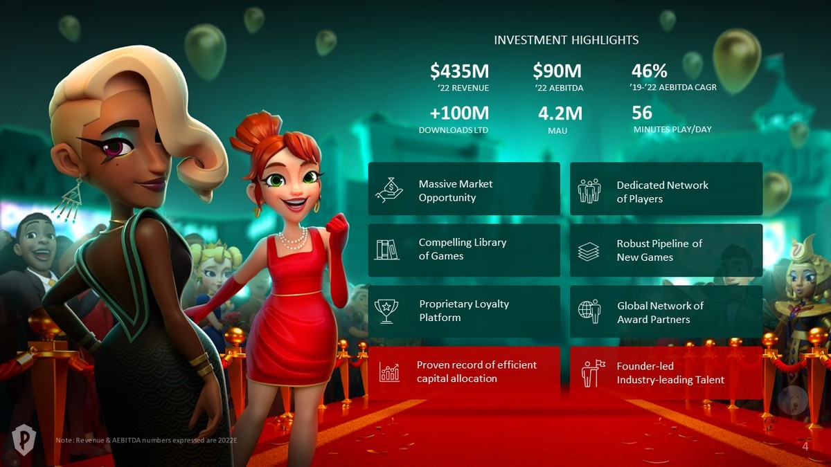 Robust Pipeline of New Games Founder - led Industry - leading Talent Massive Market Opportunity Compelling Library of Games Proven record of efficient capital allocation Proprietary Loyalty Platform Global Network of Award Partners Dedicated Network of Players $90M ‘22 AEBITDA 4.2M MAU 46% ’19 - ’22 AEBITDA CAGR 56 MINUTES PLAY/DAY $435M ‘22 REVENUE +100M DOWNLOADS LTD INVESTMENT HIGHLIGHTS