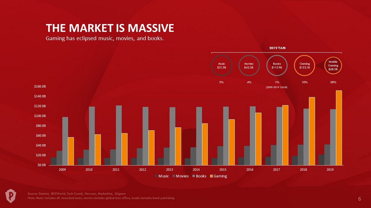 $0.0B $20.0B $40.0B $60.0B $80.0B $100.0B $120.0B $140.0B $160.0B 2009 2010 2011 2012 2013 2014 2015 2016 2017 2018 2019 Music Movies Books Gaming THE MARKET IS MASSIVE Gaming has eclipsed music, movies, and books. 2019 TAM (2009 - 2019 CAGR) Music $21.5B 3% Movies $42.2B 4% Books $113.9B 1% Gaming $152.1B 10% 38% Mobile Gaming $68.5B