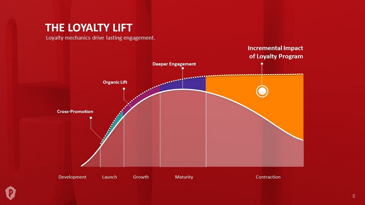 THE LOYALTY LIFT Loyalty mechanics drive lasting engagement. Incremental Impact of Loyalty Program Cross - Promotion Organic Lift Deeper Engagement Development Launch Growth Maturity Contraction