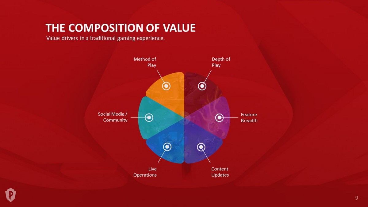 THE COMPOSITION OF VALUE Value drivers in a traditional gaming experience. Method of Play Social Media / Community Live Operations Content Updates Feature Breadth Depth of Play