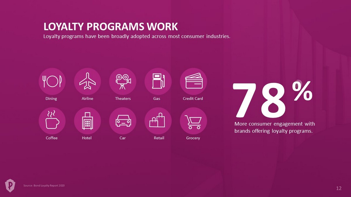 More consumer engagement with brands offering loyalty programs. Hotel Grocery Retail Theaters Dining Airline Car Coffee Gas Credit Card LOYALTY PROGRAMS WORK Loyalty programs have been broadly adopted across most consumer industries. 8 % 7