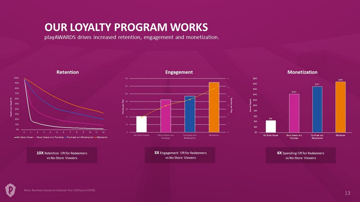 0% 10% 20% 30% 40% 50% 60% 70% 80% 90% 100% 0 1 2 3 4 5 6 7 8 9 10 11 12 No Store Viewer Store Viewer w/o Purchase Purchase w/o Redemption Redeemer OUR LOYALTY PROGRAM WORKS playAWARDS drives increased retention, engagement and monetization. Engagement Retention 10X Retention lift for Redeemers vs No - Store Viewers 4X Spending lift for Redeemers vs No - Store Viewers Minutes per Day Sessions per Day Month over Month % $44 $143 $171 $188 $0 $20 $40 $60 $80 $100 $120 $140 $160 $180 $200 No Store Viewer Store Viewer w/o Purchase Purchase w/o Redemption Redeemer Monetization Annual Spend 3X Engagement lift for Redeemers vs No - Store Viewers