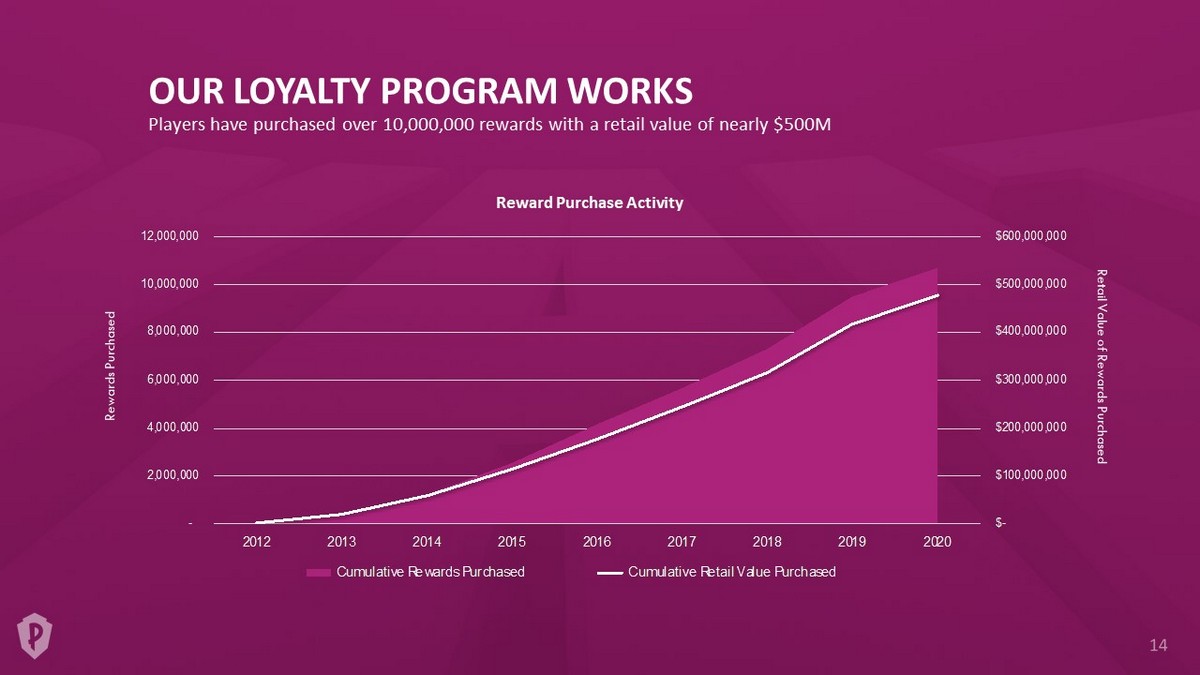 $- $100,000,000 $200,000,000 $300,000,000 $400,000,000 $500,000,000 $600,000,000 - 2,000,000 4,000,000 6,000,000 8,000,000 10,000,000 12,000,000 2012 2013 2014 2015 2016 2017 2018 2019 2020 Cumulative Rewards Purchased Cumulative Retail Value Purchased OUR LOYALTY PROGRAM WORKS Players have purchased over 10,000,000 rewards with a retail value of nearly $500M Reward Purchase Activity Retail Value of Rewards Purchased Rewards Purchased