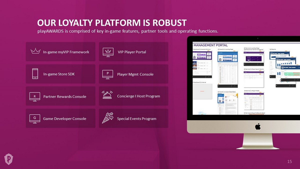 OUR LOYALTY PLATFORM IS ROBUST playAWARDS is comprised of key in - game features, partner tools and operating functions. VIP Player Portal Player Mgmt Console Special Events Program Concierge I Host Program In - game myVIP Framework In - game Store SDK Game Developer Console Partner Rewards Console R