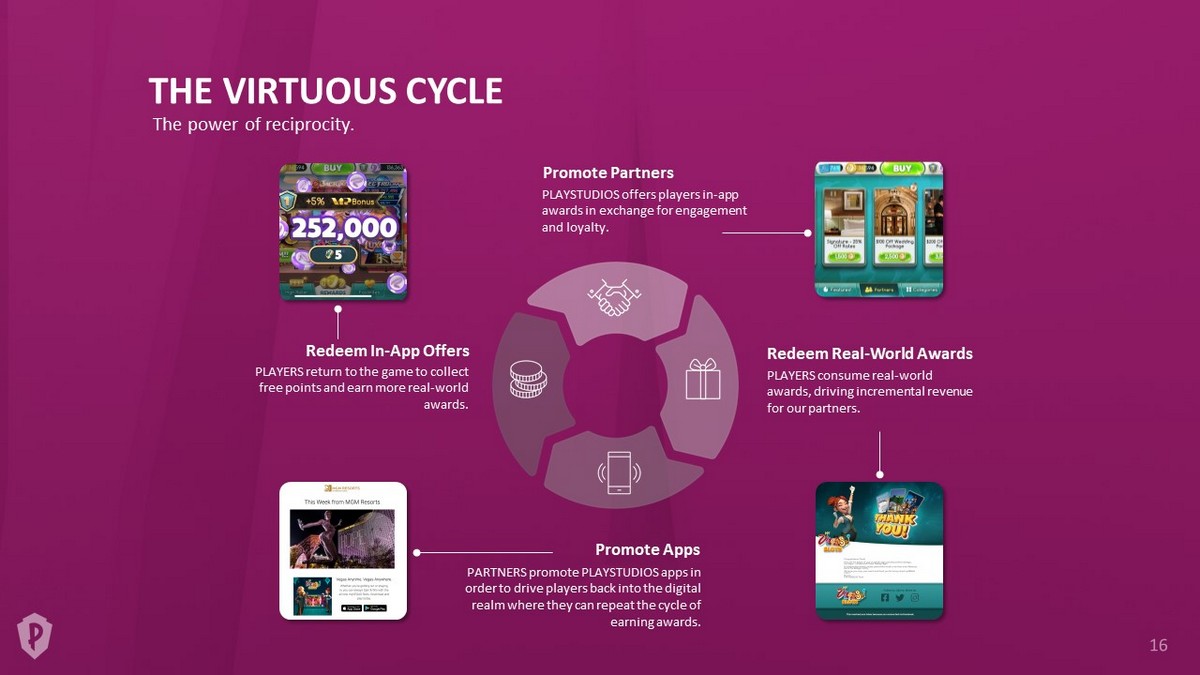 THE VIRTUOUS CYCLE Promote Partners PLAYSTUDIOS offers players in - app awards in exchange for engagement and loyalty. Redeem Real - World Awards PLAYERS consume real - world awards, driving incremental revenue for our partners. Redeem In - App Offers PLAYERS return to the game to collect free points and earn more real - world awards. Promote Apps PARTNERS promote PLAYSTUDIOS apps in order to drive players back into the digital realm where they can repeat the cycle of earning awards. The power of reciprocity.