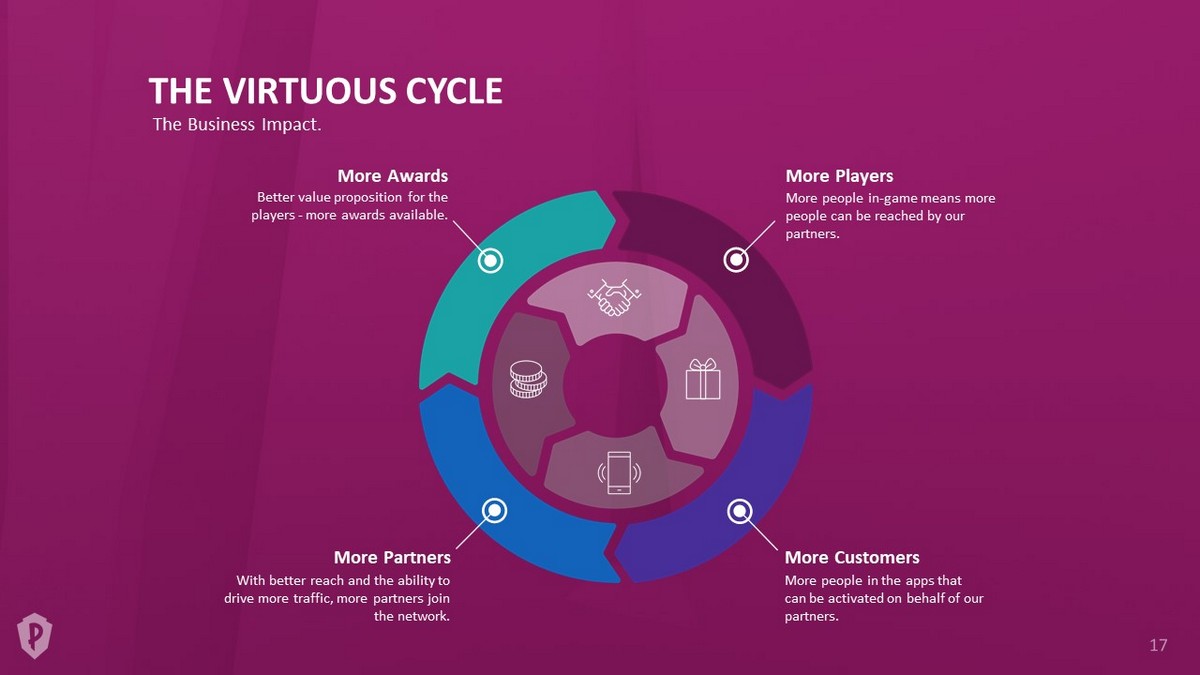 THE VIRTUOUS CYCLE More people in - game means more people can be reached by our partners. More Players More people in the apps that can be activated on behalf of our partners. More Customers With better reach and the ability to drive more traffic, more partners join the network. More Partners Better value proposition for the players - more awards available. More Awards The Business Impact.