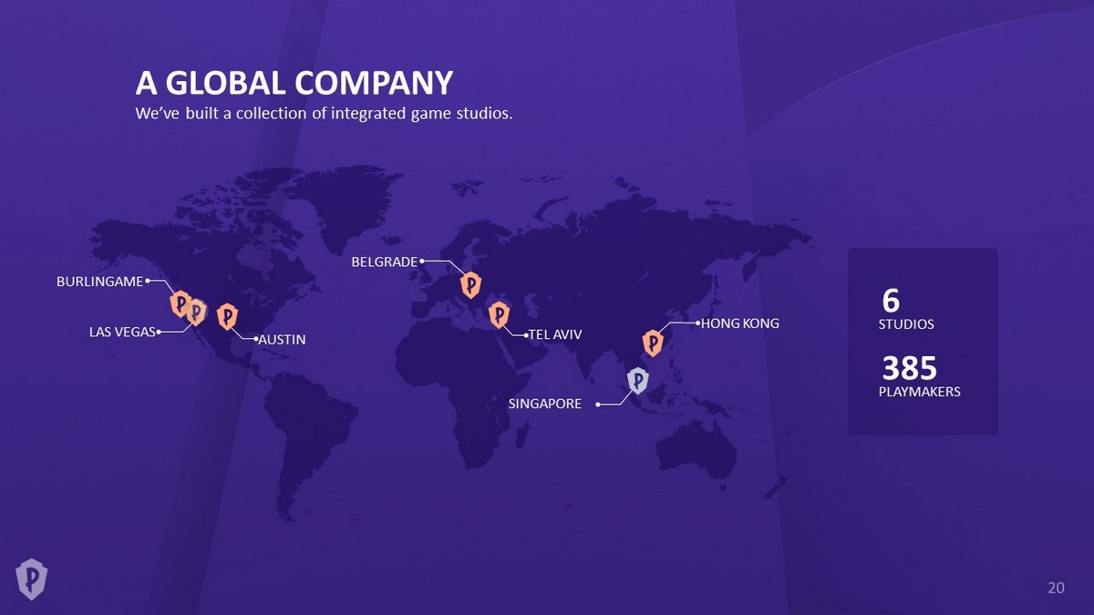 A GLOBAL COMPANY BURLINGAME LAS VEGAS AUSTIN BELGRADE TEL AVIV HONG KONG SINGAPORE STUDIOS 6 PLAYMAKERS 385 We’ve built a collection of integrated game studios.