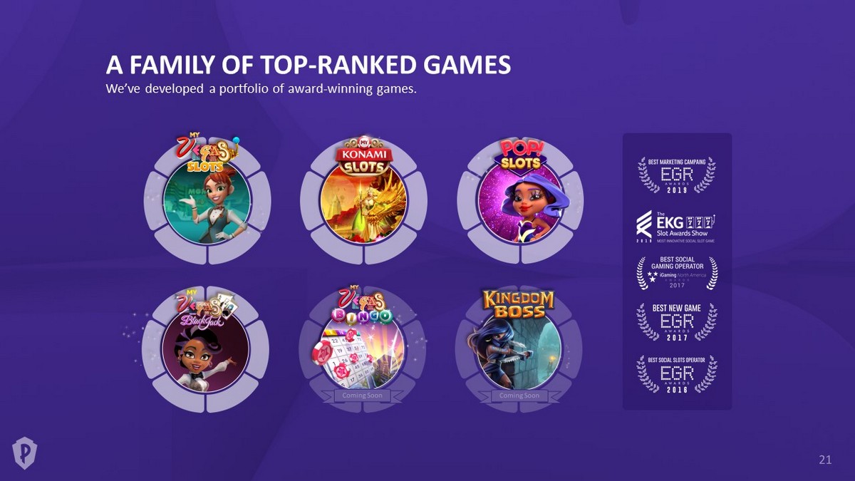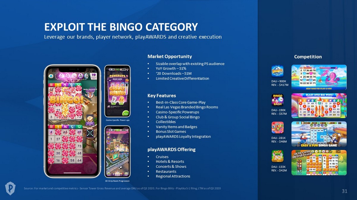 EXPLOIT THE BINGO CATEGORY Leverage our brands, player network, playAWARDS and creative execution Competition • Best - in - Class Core Game - Play • Real Las Vegas Branded Bingo Rooms • Casino - Specific Powerups • Club & Group Social Bingo • Collectibles • Vanity Items and Badges • Bonus Slot Games • playAWARDS Loyalty Integration Key Features Market Opportunity • Sizable overlap with existing PS audience • YoY Growth – 51% • ‘20 Downloads – 51M • Limited Creative Differentiation 3D Strip Room Progression Casino - Specific Power - ups DAU – 900K REV. - $417M DAU - 190K REV. - $57M DAU - 281K REV. - $46M DAU - 133K REV. - $42M playAWARDS Offering • Cruises • Hotels & Resorts • Concerts & Shows • Restaurants • Regional Attractions