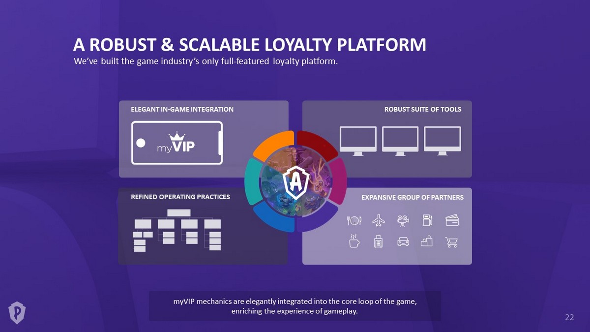 A ROBUST & SCALABLE LOYALTY PLATFORM We’ve built the game industry’s only full - featured loyalty platform. ELEGANT IN - GAME INTEGRATION ROBUST SUITE OF TOOLS REFINED OPERATING PRACTICES EXPANSIVE GROUP OF PARTNERS myVIP mechanics are elegantly integrated into the core loop of the game, enriching the experience of gameplay.
