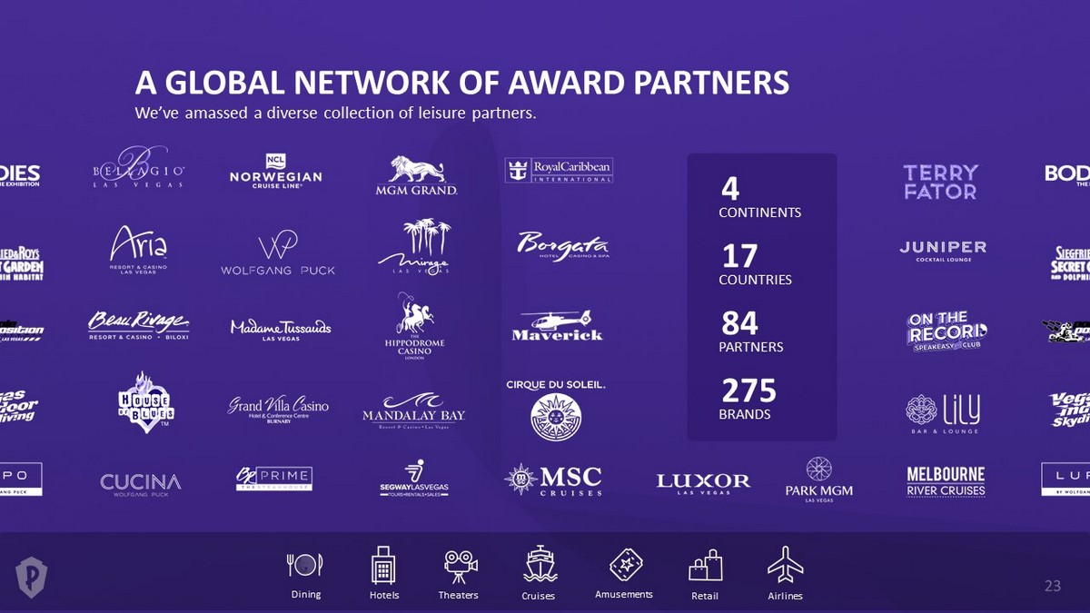 A GLOBAL NETWORK OF AWARD PARTNERS We’ve amassed a diverse collection of leisure partners. CONTINENTS 4 COUNTRIES 17 PARTNERS 84 BRANDS 275 Dining Theaters Airlines Retail Cruises Hotels Amusements