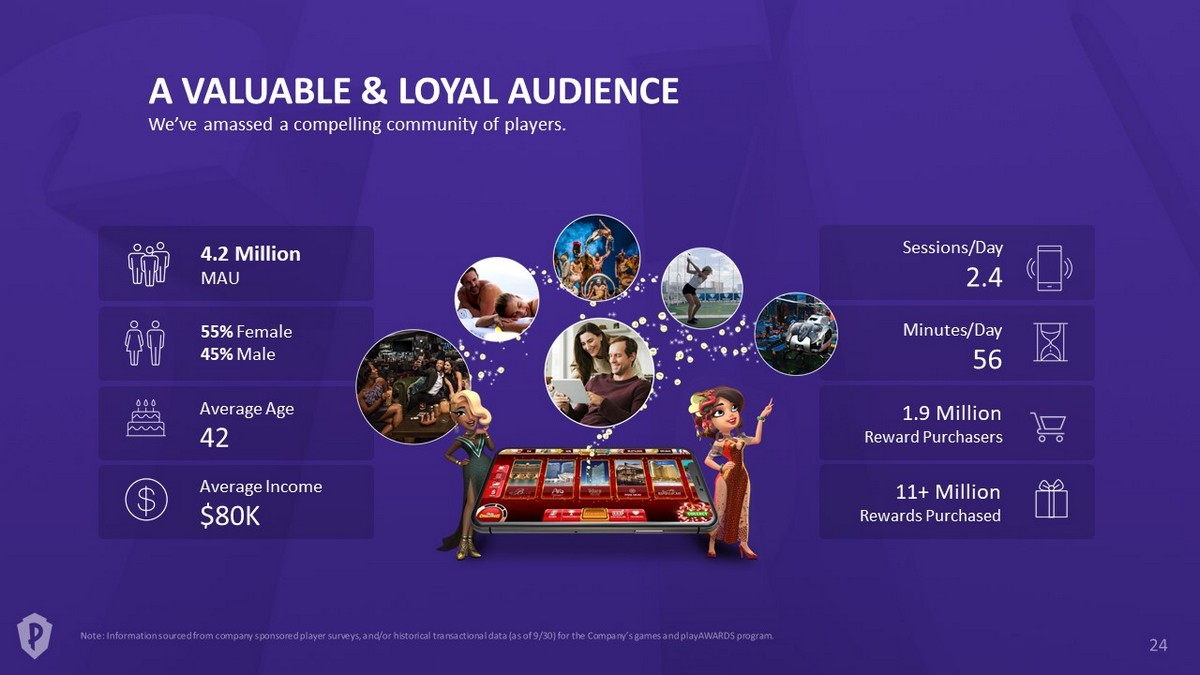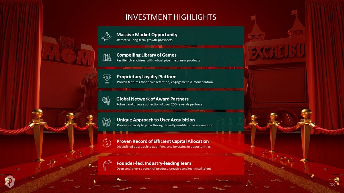 Massive Market Opportunity Attractive long - term growth prospects Proven Record of Efficient Capital Allocation Disciplined approach to qualifying and investing in opportunities Compelling Library of Games Resilient franchises, with robust pipeline of new products Unique Approach to User Acquisition Proven capacity to grow through loyalty - enabled cross - promotion Global Network of Award Partners Robust and diverse collection of over 250 rewards partners Proprietary Loyalty Platform Proven features that drive retention, engagement & monetization Founder - led, Industry - leading Team Deep and diverse bench of product, creative and technical talent INVESTMENT HIGHLIGHTS