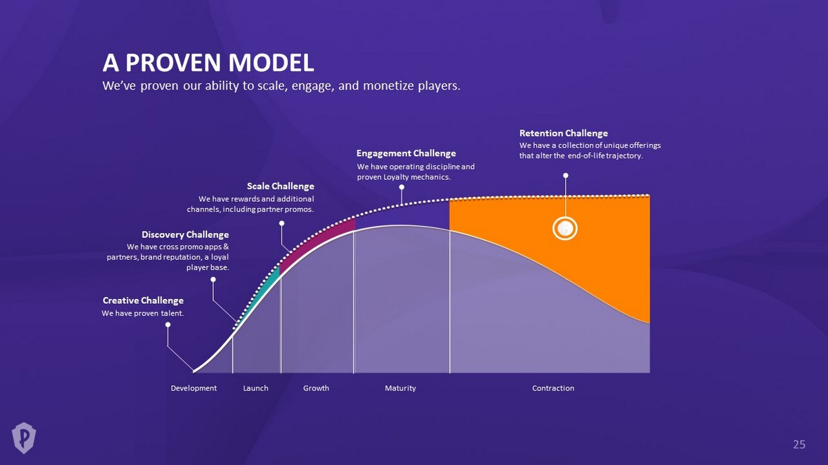 A PROVEN MODEL We’ve proven our ability to scale, engage, and monetize players. Creative Challenge We have proven talent. Discovery Challenge We have cross promo apps & partners, brand reputation, a loyal player base. Development Launch Growth Maturity Contraction Scale Challenge We have rewards and additional channels, including partner promos. Engagement Challenge We have operating discipline and proven Loyalty mechanics. Retention Challenge We have a collection of unique offerings that alter the end - of - life trajectory.