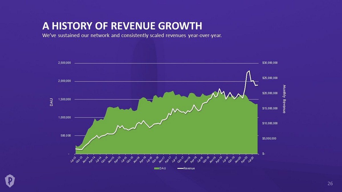 $- $5,000,000 $10,000,000 $15,000,000 $20,000,000 $25,000,000 $30,000,000 - 500,000 1,000,000 1,500,000 2,000,000 2,500,000 J u l - 1 3 O c t - 1 3 J a n - 1 4 A p r - 1 4 J u l - 1 4 O c t - 1 4 J a n - 1 5 A p r - 1 5 J u l - 1 5 O c t - 1 5 J a n - 1 6 A p r - 1 6 J u l - 1 6 O c t - 1 6 J a n - 1 7 A p r - 1 7 J u l - 1 7 O c t - 1 7 J a n - 1 8 A p r - 1 8 J u l - 1 8 O c t - 1 8 J a n - 1 9 A p r - 1 9 J u l - 1 9 O c t - 1 9 J a n - 2 0 A p r - 2 0 J u l - 2 0 DAU Revenue A HISTORY OF REVENUE GROWTH We’ve sustained our network and consistently scaled revenues year - over - year. DAU Monthly Revenue