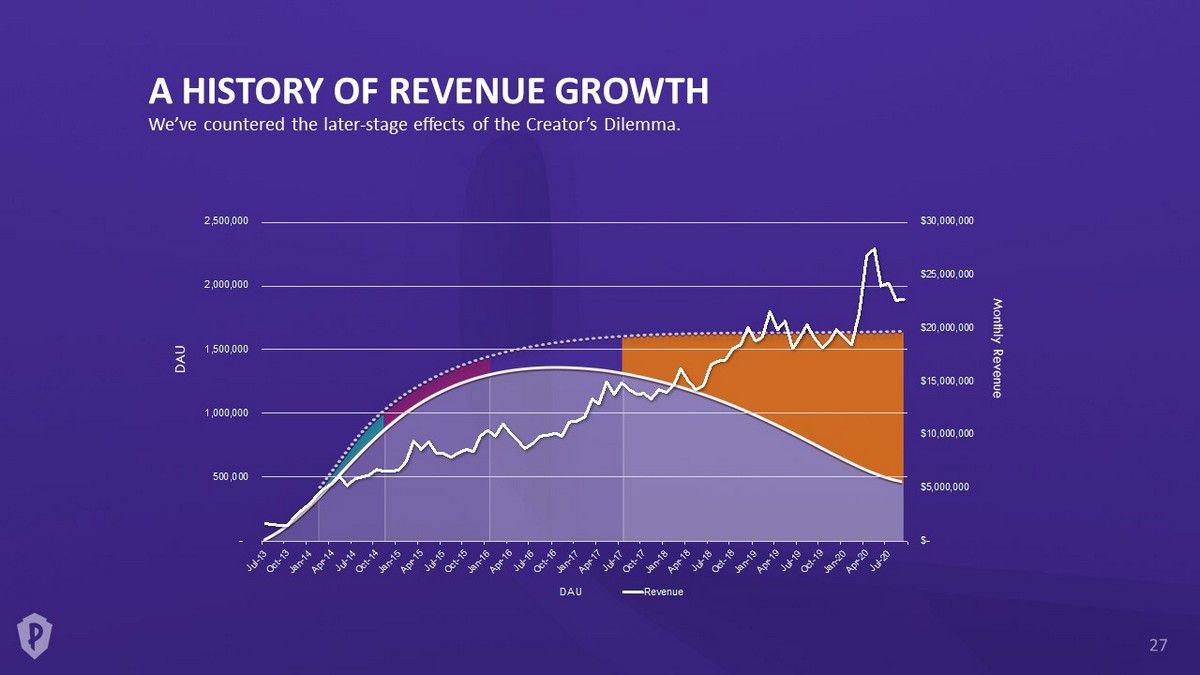 A HISTORY OF REVENUE GROWTH We’ve countered the later - stage effects of the Creator’s Dilemma. DAU Monthly Revenue $- $5,000,000 $10,000,000 $15,000,000 $20,000,000 $25,000,000 $30,000,000 - 500,000 1,000,000 1,500,000 2,000,000 2,500,000 J u l - 1 3 O c t - 1 3 J a n - 1 4 A p r - 1 4 J u l - 1 4 O c t - 1 4 J a n - 1 5 A p r - 1 5 J u l - 1 5 O c t - 1 5 J a n - 1 6 A p r - 1 6 J u l - 1 6 O c t - 1 6 J a n - 1 7 A p r - 1 7 J u l - 1 7 O c t - 1 7 J a n - 1 8 A p r - 1 8 J u l - 1 8 O c t - 1 8 J a n - 1 9 A p r - 1 9 J u l - 1 9 O c t - 1 9 J a n - 2 0 A p r - 2 0 J u l - 2 0 DAU Revenue
