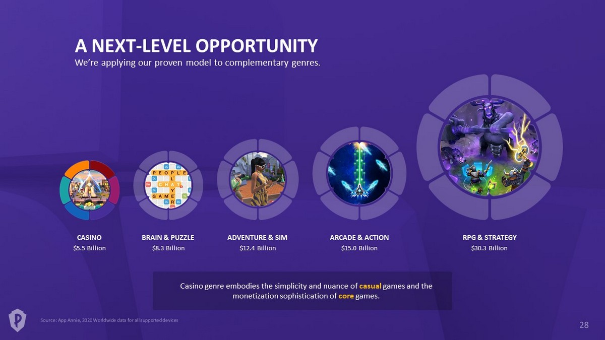 $5.5 Billion CASINO $30.3 Billion RPG & STRATEGY $8.3 Billion BRAIN & PUZZLE $15.0 Billion ARCADE & ACTION $12.4 Billion ADVENTURE & SIM A NEXT - LEVEL OPPORTUNITY We’re applying our proven model to complementary genres. Casino genre embodies the simplicity and nuance of casual games and the monetization sophistication of core games.