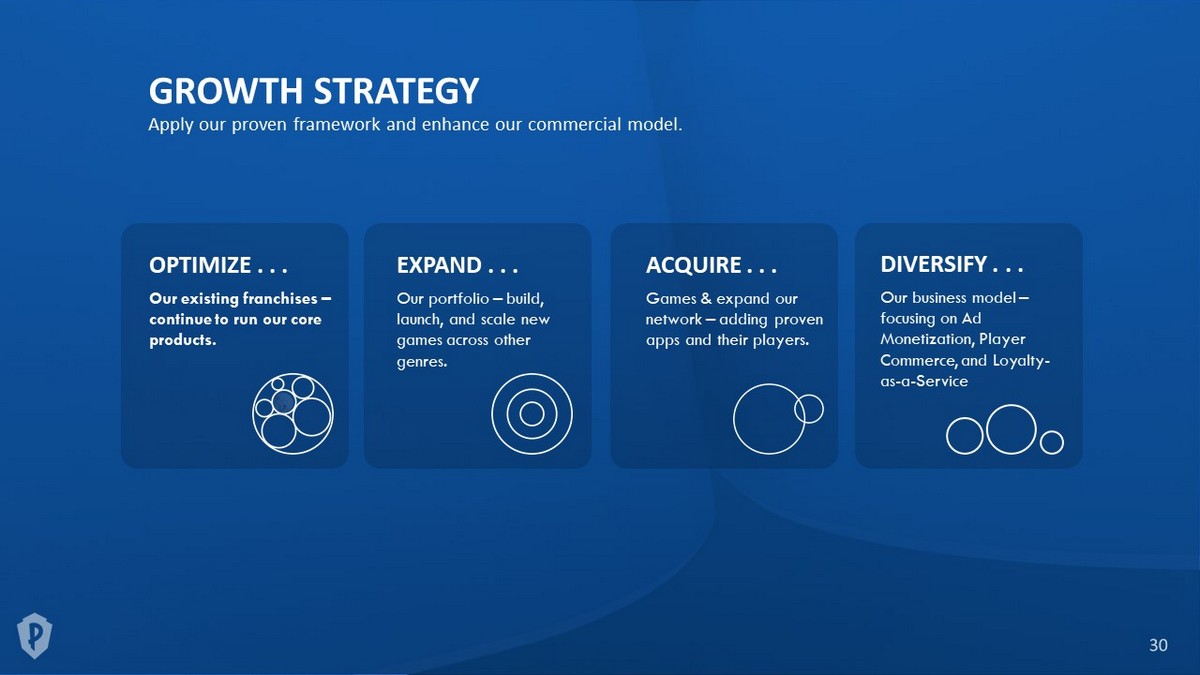 GROWTH STRATEGY Apply our proven framework and enhance our commercial model. OPTIMIZE . . . Our existing franchises – continue to run our core products. EXPAND . . . Our portfolio – build, launch, and scale new games across other genres. ACQUIRE . . . Games & expand our network – adding proven apps and their players. DIVERSIFY . . . Our business model – focusing on Ad Monetization, Player Commerce, and Loyalty - as - a - Service