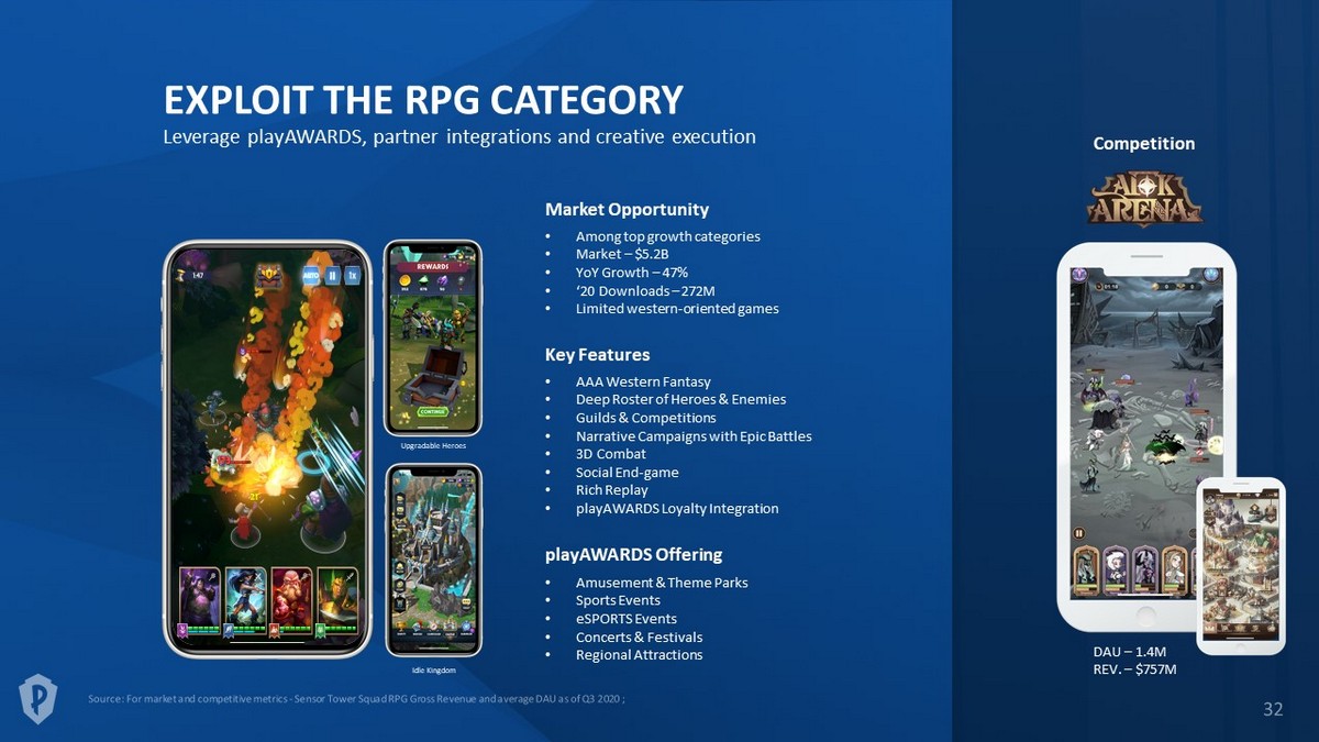 • Among top growth categories • Market – $5.2B • YoY Growth – 47% • ‘20 Downloads – 272M • Limited western - oriented games EXPLOIT THE RPG CATEGORY Leverage playAWARDS , partner integrations and creative execution Competition Idle Kingdom Upgradable Heroes • AAA Western Fantasy • Deep Roster of Heroes & Enemies • Guilds & Competitions • Narrative Campaigns with Epic Battles • 3D Combat • Social End - game • Rich Replay • playAWARDS Loyalty Integration Key Features Market Opportunity DAU – 1.4M REV. – $757M playAWARDS Offering • Amusement & Theme Parks • Sports Events • eSPORTS Events • Concerts & Festivals • Regional Attractions