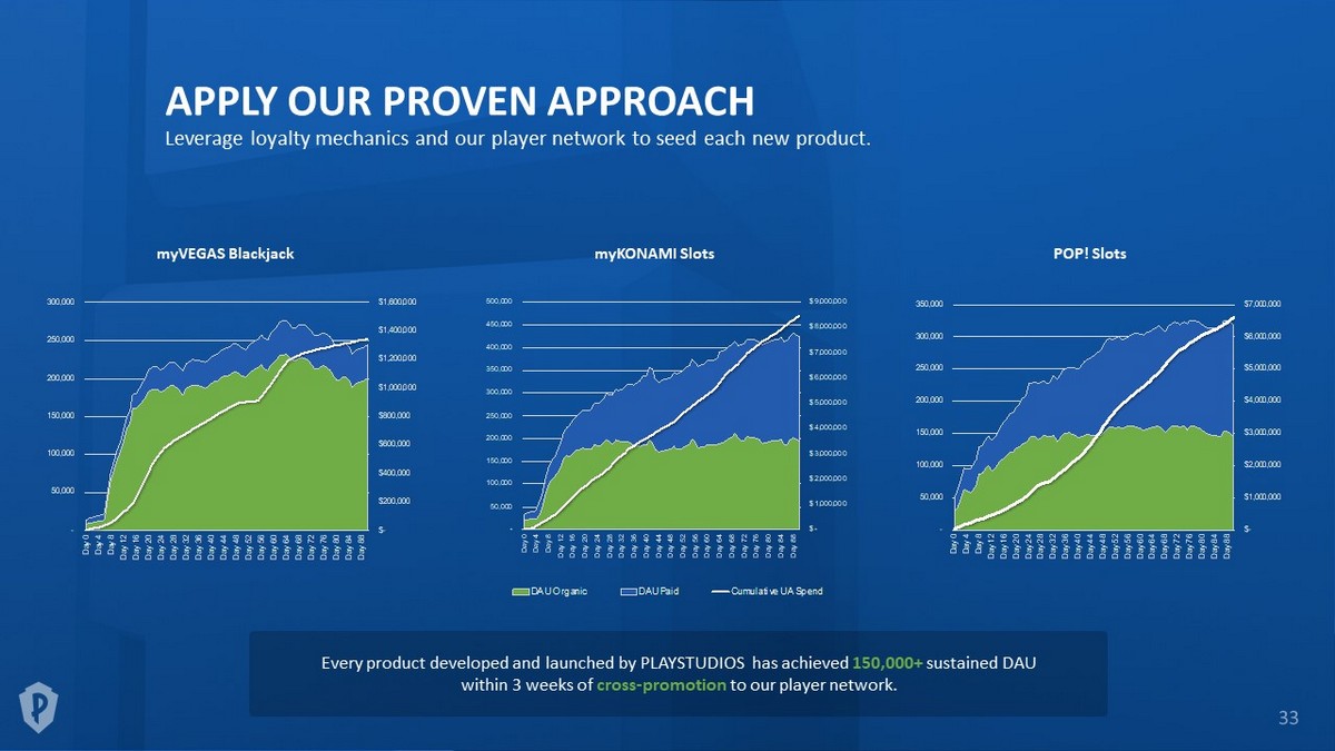 $- $1,000,000 $2,000,000 $3,000,000 $4,000,000 $5,000,000 $6,000,000 $7,000,000 - 50,000 100,000 150,000 200,000 250,000 300,000 350,000 D a y 0 D a y 4 D a y 8 D a y 1 2 D a y 1 6 D a y 2 0 D a y 2 4 D a y 2 8 D a y 3 2 D a y 3 6 D a y 4 0 D a y 4 4 D a y 4 8 D a y 5 2 D a y 5 6 D a y 6 0 D a y 6 4 D a y 6 8 D a y 7 2 D a y 7 6 D a y 8 0 D a y 8 4 D a y 8 8 $- $1,000,000 $2,000,000 $3,000,000 $4,000,000 $5,000,000 $6,000,000 $7,000,000 $8,000,000 $9,000,000 - 50,000 100,000 150,000 200,000 250,000 300,000 350,000 400,000 450,000 500,000 D a y 0 D a y 4 D a y 8 D a y 1 2 D a y 1 6 D a y 2 0 D a y 2 4 D a y 2 8 D a y 3 2 D a y 3 6 D a y 4 0 D a y 4 4 D a y 4 8 D a y 5 2 D a y 5 6 D a y 6 0 D a y 6 4 D a y 6 8 D a y 7 2 D a y 7 6 D a y 8 0 D a y 8 4 D a y 8 8 DAU Organic DAU Paid Cumulative UA Spend $- $200,000 $400,000 $600,000 $800,000 $1,000,000 $1,200,000 $1,400,000 $1,600,000 - 50,000 100,000 150,000 200,000 250,000 300,000 D a y 0 D a y 4 D a y 8 D a y 1 2 D a y 1 6 D a y 2 0 D a y 2 4 D a y 2 8 D a y 3 2 D a y 3 6 D a y 4 0 D a y 4 4 D a y 4 8 D a y 5 2 D a y 5 6 D a y 6 0 D a y 6 4 D a y 6 8 D a y 7 2 D a y 7 6 D a y 8 0 D a y 8 4 D a y 8 8 APPLY OUR PROVEN APPROACH Leverage loyalty mechanics and our player network to seed each new product. myVEGAS Blackjack myKONAMI Slots POP! Slots Every product developed and launched by PLAYSTUDIOS has achieved 150,000+ sustained DAU within 3 weeks of cross - promotion to our player network.