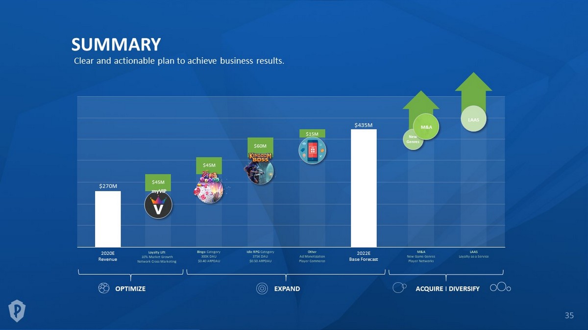 SUMMARY Clear and actionable plan to achieve business results. Loyalty Lift 10% Market Growth Network Cross - Marketing Bingo Category 300K DAU $0.40 ARPDAU Idle RPG Category 375K DAU $0.50 ARPDAU $270M $435M 2020E Revenue 2022E Base Forecast M&A New Game Genres Player Networks $45M $45M $60M EXPAND OPTIMIZE Other Ad Monetization Player Commerce $15M ACQUIRE I DIVERSIFY myVIP New Genres LAAS M&A LAAS Loyalty - as - a - Service