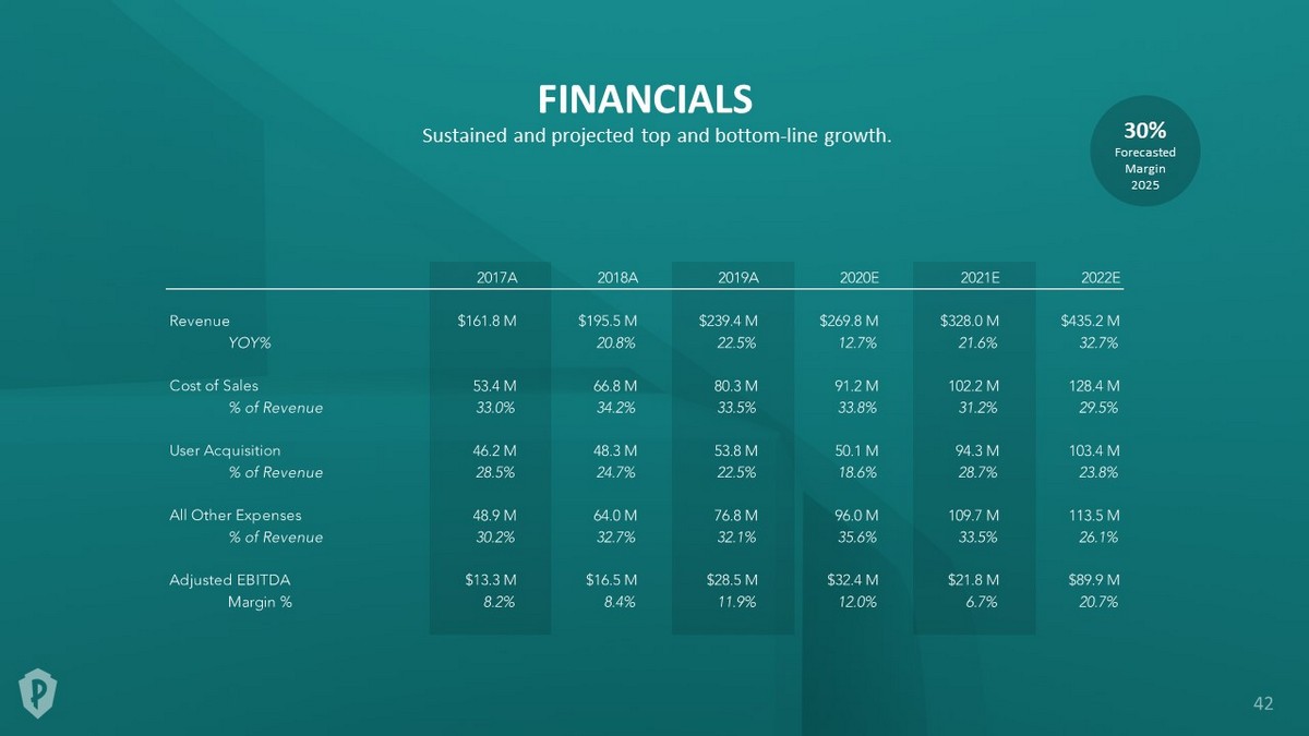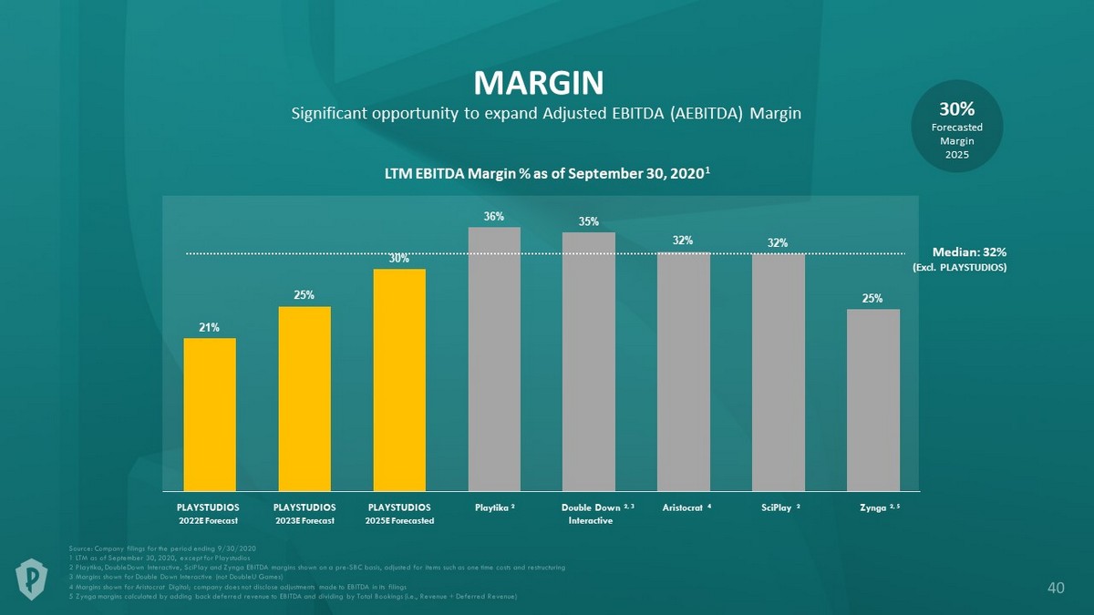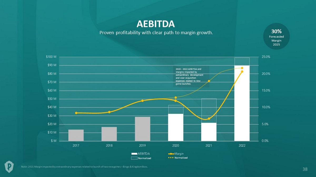 2020 - 2022 AEBITDA and Margins Impacted by extraordinary development and User Acquisition expenses related to new game launches. AEBITDA Proven profitability with clear path to margin growth. Forecasted Margin 2025 30% Normalized Normalized