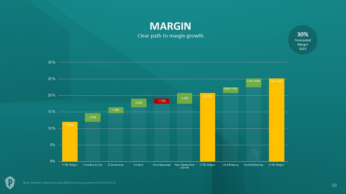 MARGIN Clear path to margin growth. 12.0% 20.7% 2.6% 1.8% 2.6% 1.5% 3.2% 0% 5% 10% 15% 20% 25% 30% CY20 Margin Core Bus Op Ex E Commerce Ad Mon Corp Expenses New Games Post Launch CY22 Margin UA Efficiency Op Ex Efficiency CY23 Margin 2.0% - 2.5% 2.5% - 3.0% 25% - 26% Forecasted Margin 2025 30%
