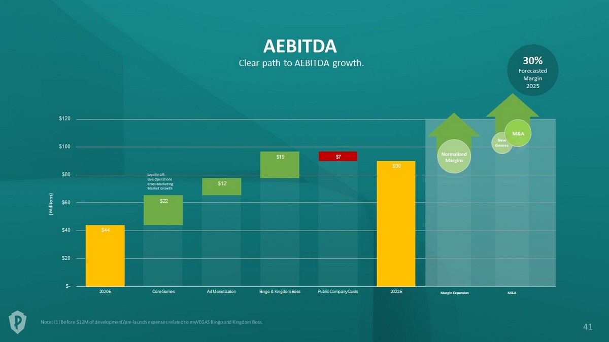 AEBITDA Clear path to AEBITDA growth. Forecasted Margin 2025 30% (1) Loyalty Lift Live Operations Cross - Marketing Market Growth (Millions) $44 $90 $22 $12 $19 $7 $- $20 $40 $60 $80 $100 $120 2020E Core Games Ad Monetization Bingo & Kingdom Boss Public Company Costs 2022E Margin Expansion M&A Normalized Margins New Genres M&A