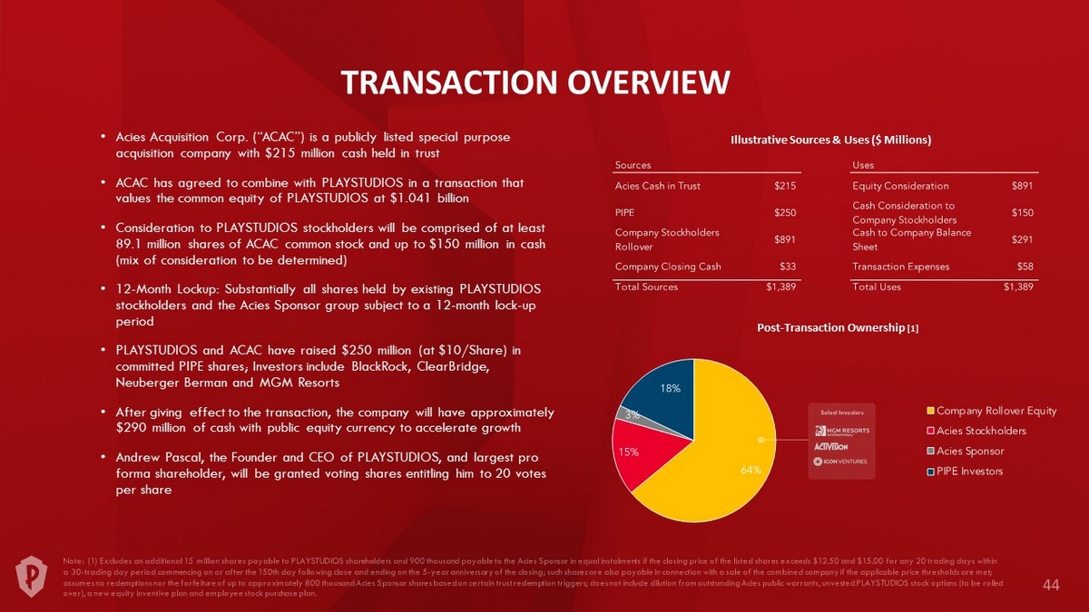 TRANSACTION OVERVIEW Illustrative Sources & Uses ($ Millions) Post - Transaction Ownership [1] • Acies Acquisition Corp. (“ACAC”) is a publicly listed special purpose acquisition company with $215 million cash held in trust • ACAC has agreed to combine with PLAYSTUDIOS in a transaction that values the common equity of PLAYSTUDIOS at $1.041 billion • Consideration to PLAYSTUDIOS stockholders will be comprised of at least 89.1 million shares of ACAC common stock and up to $150 million in cash (mix of consideration to be determined) • 12 - Month Lockup: Substantially all shares held by existing PLAYSTUDIOS stockholders and the Acies Sponsor group subject to a 12 - month lock - up period • PLAYSTUDIOS and ACAC have raised $250 million (at $10/Share) in committed PIPE shares; Investors include BlackRock, ClearBridge , Neuberger Berman and MGM Resorts • After giving effect to the transaction, the company will have approximately $290 million of cash with public equity currency to accelerate growth • Andrew Pascal, the Founder and CEO of PLAYSTUDIOS, and largest pro forma shareholder, will be granted voting shares entitling him to 20 votes per share
