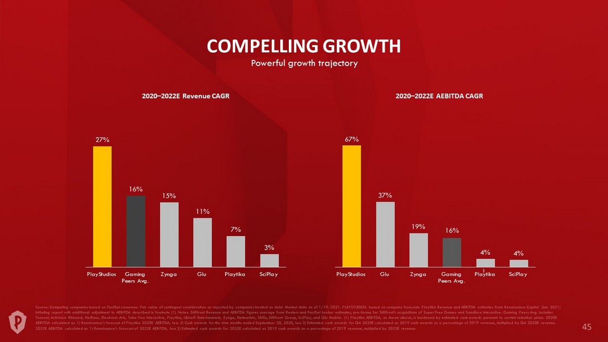 67% 37% 19% 16% 4% 4% PlayStudios Glu Zynga Gaming Peers Avg. Playtika SciPlay 2020 – 2022E Revenue CAGR 2020 – 2022E AEBITDA CAGR 1 27% 16% 15% 11% 7% 3% PlayStudios Gaming Peers Avg. Zynga Glu Playtika SciPlay COMPELLING GROWTH Powerful growth trajectory