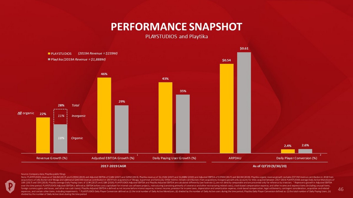 22% 46% 43% $0.54 2.4% 29% 35% $0.61 2.6% Revenue Growth (%) Adjusted EBITDA Growth (%) Daily Paying User Growth (%) ARPDAU Daily Player Conversion (%) PLAYSTUDIOS Playtika 28% 11% 2017 - 2019 CAGR 2 As of Q3’20 (9/30/20) 1 Organic Total Inorganic (2019A Revenue = $239M) All organic 18% PERFORMANCE SNAPSHOT (2019A Revenue = $1,888M) PLAYSTUDIOS and Playtika