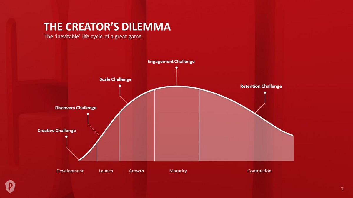THE CREATOR’S DILEMMA The ‘inevitable’ life - cycle of a great game. Development Launch Growth Maturity Contraction Creative Challenge Discovery Challenge Scale Challenge Engagement Challenge Retention Challenge