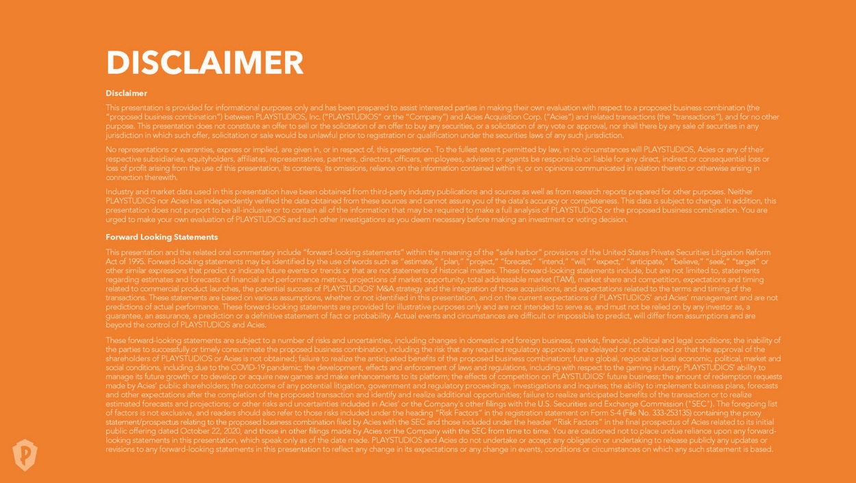 DISCLAIMER Disclaimer This presentation is provided for informational purposes only and has been prepared to assist interested parties in making their own evaluation with respect to a proposed business combination (the “proposed business combination”) between PLAYSTUDIOS, Inc. (“PLAYSTUDIOS” or the “Company”) and Acies Acquisition Corp. (“Acies”) and related transactions (the “transactions”), and for no other purpose. This presentation does not constitute an offer to sell or the solicitation of an offer to buy any securities, or a solicitation of any vote or approval, nor shall there by any sale of securities in any jurisdiction in which such offer, solicitation or sale would be unlawful prior to registration or qualification under the securities laws of any such jurisdiction. No representations or warranties, express or implied, are given in, or in respect of, this presentation. To the fullest extent permitted by law, in no circumstances will PLAYSTUDIOS, Acies or any of their respective subsidiaries, equityholders, affiliates, representatives, partners, directors, officers, employees, advisers or agents be responsible or liable for any direct, indirect or consequential loss or loss of profit arising from the use of this presentation, its contents, its omissions, reliance on the information contained within it, or on opinions communicated in relation thereto or otherwise arising in connection therewith. Industry and market data used in this presentation have been obtained from third - party industry publications and sources as well as from research reports prepared for other purposes. Neither PLAYSTUDIOS nor Acies has independently verified the data obtained from these sources and cannot assure you of the data’s accuracy or completeness. This data is subject to change. In addition, this presentation does not purport to be all - inclusive or to contain all of the information that may be required to make a full analysis of PLAYSTUDIOS or the proposed business combination. You are urged to make your own evaluation of PLAYSTUDIOS and such other investigations as you deem necessary before making an investment or voting decision. Forward Looking Statements This presentation and the related oral commentary include “forward - looking statements” within the meaning of the “safe harbor” provisions of the United States Private Securities Litigation Reform Act of 1995. Forward - looking statements may be identified by the use of words such as “estimate,” “plan,” “project,” “forecast,” “intend,” “will,” “expect,” “anticipate,” “believe,” “seek,” “target” or other similar expressions that predict or indicate future events or trends or that are not statements of historical matters. These forward - looking statements include, but are not limited to, statements regarding estimates and forecasts of financial and performance metrics, projections of market opportunity, total addressable market (TAM), market share and competition, expectations and timing related to commercial product launches, the potential success of PLAYSTUDIOS’ M&A strategy and the integration of those acquisitions, and expectations related to the terms and timing of the transactions. These statements are based on various assumptions, whether or not identified in this presentation, and on the current expectations of PLAYSTUDIOS’ and Acies’ management and are not predictions of actual performance. These forward - looking statements are provided for illustrative purposes only and are not intended to serve as, and must not be relied on by any investor as, a guarantee, an assurance, a prediction or a definitive statement of fact or probability. Actual events and circumstances are difficult or impossible to predict, will differ from assumptions and are beyond the control of PLAYSTUDIOS and Acies. These forward - looking statements are subject to a number of risks and uncertainties, including changes in domestic and foreign business, market, financial, political and legal conditions; the inability of the parties to successfully or timely consummate the proposed business combination, including the risk that any required regulatory approvals are delayed or not obtained or that the approval of the shareholders of PLAYSTUDIOS or Acies is not obtained; failure to realize the anticipated benefits of the proposed business combination; future global, regional or local economic, political, market and social conditions, including due to the COVID - 19 pandemic; the development, effects and enforcement of laws and regulations, including with respect to the gaming industry; PLAYSTUDIOS’ ability to manage its future growth or to develop or acquire new games and make enhancements to its platform; the effects of competition on PLAYSTUDIOS’ future business; the amount of redemption requests made by Acies’ public shareholders; the outcome of any potential litigation, government and regulatory proceedings, investigations and inquiries; the ability to implement business plans, forecasts and other expectations after the completion of the proposed transaction and identify and realize additional opportunities; failure to realize anticipated benefits of the transaction or to realize estimated forecasts and projections; or other risks and uncertainties included in Acies’ or the Company's other filings with the U.S. Securities and Exchange Commission ("SEC"). The foregoing list of factors is not exclusive, and readers should also refer to those risks included under the heading “Risk Factors” in the registration statement on Form S - 4 (File No. 333 - 253135) containing the proxy statement/prospectus relating to the proposed business combination filed by Acies with the SEC and those included under the header “Risk Factors” in the final prospectus of Acies related to its initial public offering dated October 22, 2020, and those in other filings made by Acies or the Company wi