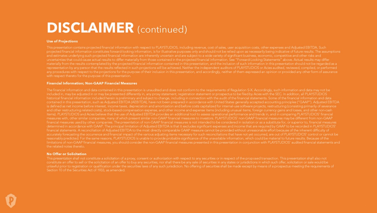 DISCLAIMER (continued) Use of Projections This presentation contains projected financial information with respect to PLAYSTUDIOS, including revenue, cost of sales, user acquisition costs, other expenses and Adjusted EBITDA. Such projected financial information constitutes forward - looking information, is for illustrative purposes only and should not be relied upon as necessarily being indicative of future results. The assumptions and estimates underlying such projected financial information are inherently uncertain and are subject to a wide variety of significant business, economic, competitive and other risks and uncertainties that could cause actual results to differ materially from those contained in the projected financial information. See “Forward - Looking Statements” above. Actual results may differ materially from the results contemplated by the projected financial information contained in this presentation, and the inclusion of such information in this presentation should not be regarded as a representation by any person that the results reflected in such projections will be achieved. Neither the independent auditors of PLAYSTUDIOS or Acies audited, reviewed, compiled, or performed any procedures with respect to the projections for the purpose of their inclusion in this presentation, and accordingly, neither of them expressed an opinion or provided any other form of assurance with respect thereto for the purpose of this presentation. Financial Information; Non - GAAP Financial Measures The financial information and data contained in this presentation is unaudited and does not conform to the requirements of Regulation S - X. Accordingly, such information and data may not be included in, may be adjusted in or may be presented differently in, any proxy statement, registration statement or prospectus to be filed by Acies with the SEC. In addition, all PLAYSTUDIOS historical financial information included herein is preliminary and subject to change, including in connection with the audit of the financial statements. Some of the financial information and data contained in this presentation, such as Adjusted EBITDA (AEBITDA), have not been prepared in accordance with United States generally accepted accounting principles (“GAAP”). Adjusted EBITDA is defined as net income before interest, income taxes, depreciation and amortization and before costs capitalized for internal - use software projects, restructuring (consisting primarily of severance and other restructuring related costs), stock - based compensation expense, and other income and expense items (including unusual items, foreign currency gains and losses, and other non - cash items). PLAYSTUDIOS and Acies believe that the use of Adjusted EBITDA provides an additional tool to assess operational performance and trends in, and in comparing PLAYSTUDIOS’ financial measures with, other similar companies, many of which present similar non - GAAP financial measures to investors. PLAYSTUDIOS’ non - GAAP financial measures may be different from non - GAAP financial measures used by other companies. The presentation of non - GAAP financial measures is not intended to be considered in isolation or as a substitute for, or superior to, financial measures determined in accordance with GAAP. The principal limitation of Adjusted EBITDA is that it excludes significant expenses and income that are required by GAAP to be recorded in PLAYSTUDIOS’ financial statements. A reconciliation of Adjusted EBITDA to the most directly comparable GAAP measure cannot be provided without unreasonable effort because of the inherent difficulty of accurately forecasting the occurrence and financial impact of the various adjusting items necessary for such reconciliations that have not yet occurred, are out of PLAYSTUDIOS’ control or cannot be reasonably predicted. For the same reasons, PLAYSTUDIOS is unable to provide probable significance of the unavailable information, which could be material to future results. Because of the limitations of non - GAAP financial measures, you should consider the non - GAAP financial measures presented in this presentation in conjunction with PLAYSTUDIOS’ audited financial statements and the related notes thereto. No Offer or Solicitation This presentation shall not constitute a solicitation of a proxy, consent or authorization with respect to any securities or in respect of the proposed transaction. This presentation shall also not constitute an offer to sell or the solicitation of an offer to buy any securities, nor shall there be any sale of securities in any states or jurisdictions in which such offer, solicitation or sale would be unlawful prior to registration or qualification under the securities laws of any such jurisdiction. No offering of securities shall be made except by means of a prospectus meeting the requirements of Section 10 of the Securities Act of 1933, as amended.