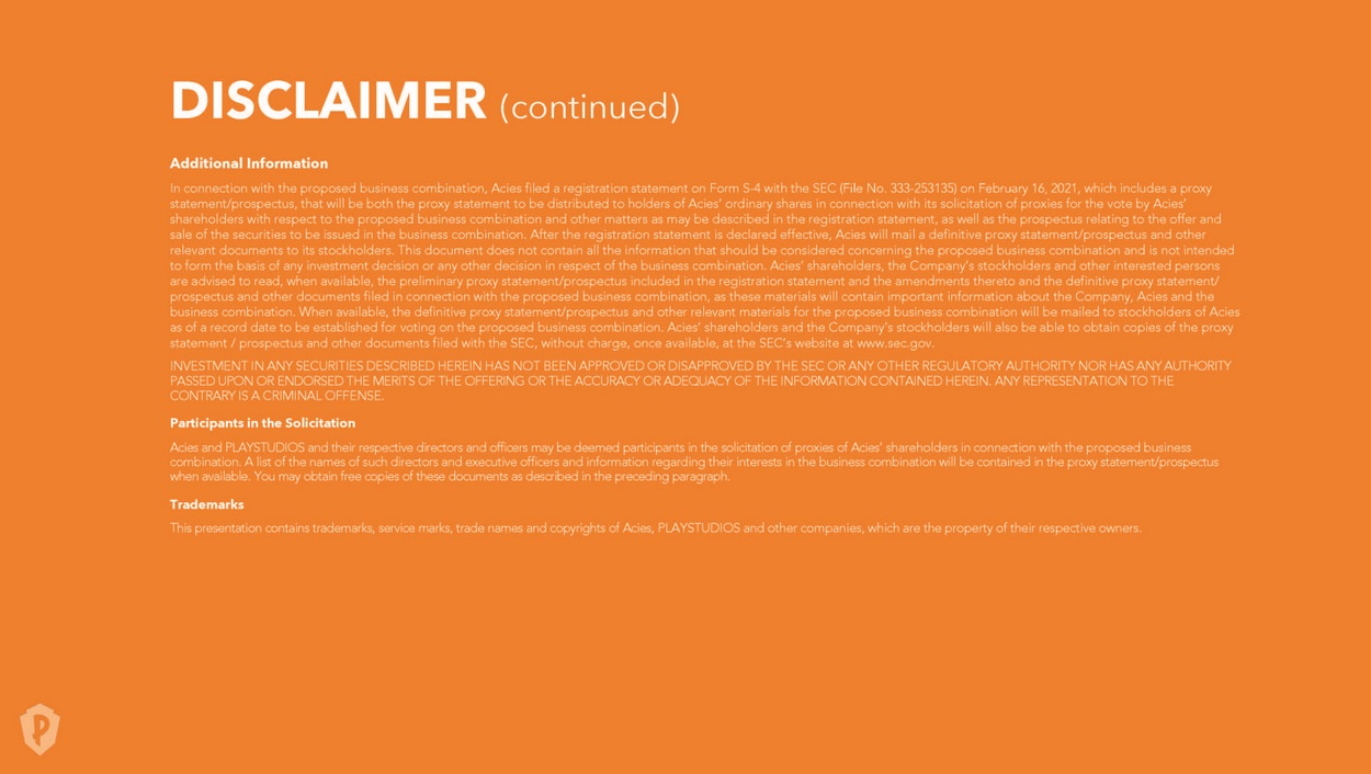 DISCLAIMER (continued) Additional Information In connection with the proposed business combination, Acies filed a registration statement on Form S - 4 with the SEC (File No. 333 - 253135) on February 16, 2021, which includes a proxy statement/prospectus, that will be both the proxy statement to be distributed to holders of Acies’ ordinary shares in connection with its solicitation of proxies for the vote by Acies’ shareholders with respect to the proposed business combination and other matters as may be described in the registration statement, as well as the prospectus relating to the offer and sale of the securities to be issued in the business combination. After the registration statement is declared effective, Acies will mail a definitive proxy statement/prospectus and other relevant documents to its stockholders. This document does not contain all the information that should be considered concerning the proposed business combination and is not intended to form the basis of any investment decision or any other decision in respect of the business combination. Acies’ shareholders, the Company’s stockholders and other interested persons are advised to read, when available, the preliminary proxy statement/prospectus included in the registration statement and the amendments thereto and the definitive proxy statement/ prospectus and other documents filed in connection with the proposed business combination, as these materials will contain important information about the Company, Acies and the business combination. When available, the definitive proxy statement/prospectus and other relevant materials for the proposed business combination will be mailed to stockholders of Acies as of a record date to be established for voting on the proposed business combination. Acies’ shareholders and the Company’s stockholders will also be able to obtain copies of the proxy statement / prospectus and other documents filed with the SEC, without charge, once available, at the SEC’s website at www.sec.gov. INVESTMENT IN ANY SECURITIES DESCRIBED HEREIN HAS NOT BEEN APPROVED OR DISAPPROVED BY THE SEC OR ANY OTHER REGULATORY AUTHORITY NOR HAS ANY AUTHORITY PASSED UPON OR ENDORSED THE MERITS OF THE OFFERING OR THE ACCURACY OR ADEQUACY OF THE INFORMATION CONTAINED HEREIN. ANY REPRESENTATION TO THE CONTRARY IS A CRIMINAL OFFENSE. Participants in the Solicitation Acies and PLAYSTUDIOS and their respective directors and officers may be deemed participants in the solicitation of proxies of Acies’ shareholders in connection with the proposed business combination. A list of the names of such directors and executive officers and information regarding their interests in the business combination will be contained in the proxy statement/prospectus when available. You may obtain free copies of these documents as described in the preceding paragraph. Trademarks This presentation contains trademarks, service marks, trade names and copyrights of Acies, PLAYSTUDIOS and other companies, which are the property of their respective owners.
