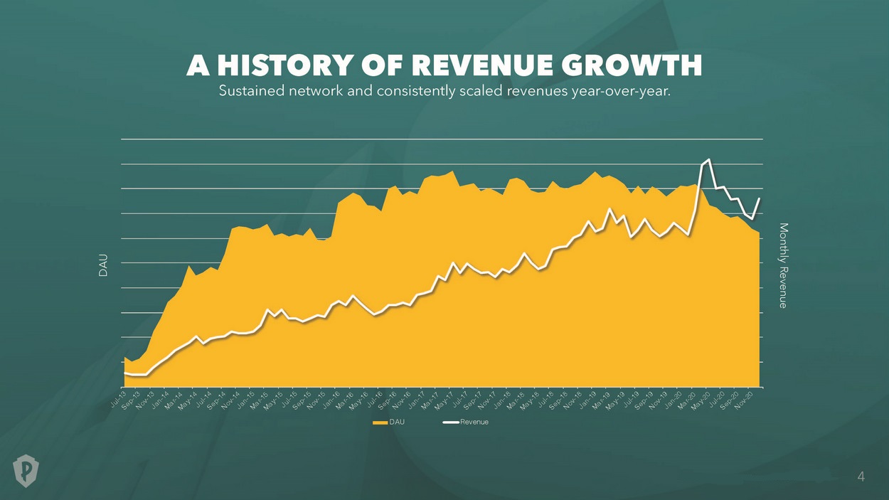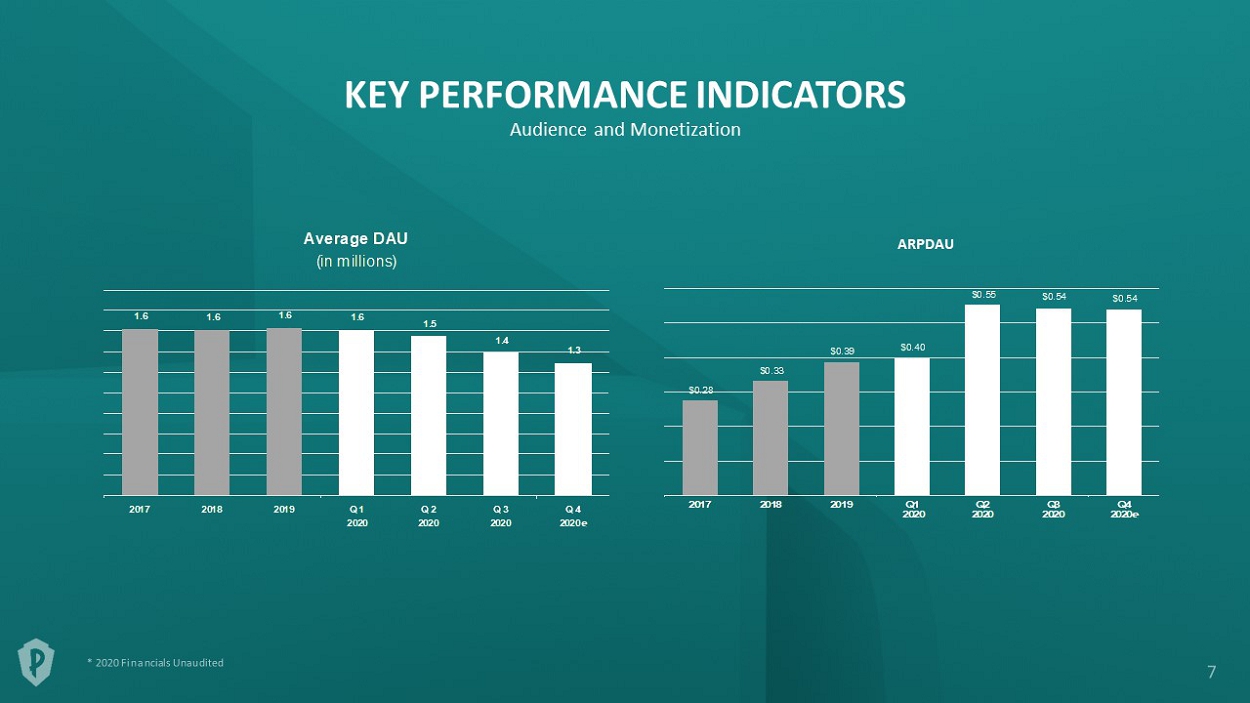 $0.33 $0.28 $0.39 $0.40 $0.55 $0.54 $0.54 2017 2018 2019 Q1 Q2 Q3 Q4 2020 2020 2020 2020e 1.6 1.6 1.6 1.6 1.5 1.4 1.3 2017 2018 2019 Q1 Q2 Q3 Q4 2020 2020 2020 2020e Average DAU (in millions) KEY PERFORMANCE INDICATORS Audience and Monetization