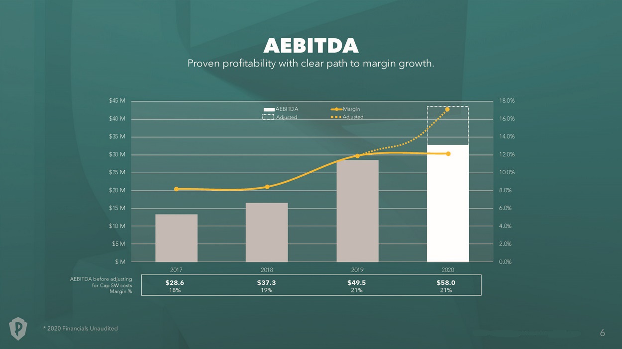 0. 0 % 2. 0 % 4. 0 % 6. 0 % 8. 0 % 1 0 . 0 % 1 2 . 0 % 1 4 . 0 % 1 6 . 0 % 1 8 . 0 % $ M $5 M $10 M $15 M $20 M $25 M $30 M $35 M $40 M $45 M AEBITDA Proven profitability with clear path to margin growth. Margin A d j u s t e d A E B I T D A Adjusted AEBITDA before adjusting for Cap SW costs Margin % 2017 $28 .6 18% 2018 $37 .3 19% 2019 $49 .5 21% 2020 $58 .0 21%