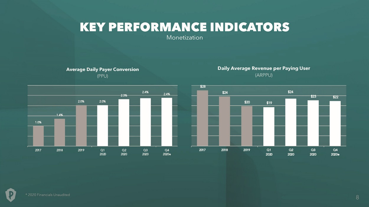 1.0% 1.4% 2.0% 2.0% 2.3% 2.4% 2.4% Average Daily Payer Conversion (PPU) $28 $24 $20 $19 $24 $23 $22 2017 2018 2019 Q1 Q2 Q3 Q4 2017 2018 2019 Q1 Q2 Q3 Q4 2020 2020 2020 2020e 2020 2020 2020 2 0 20e Daily Average Revenue per Paying User (ARPPU) KEY PERFORMANCE INDICATORS Monetization