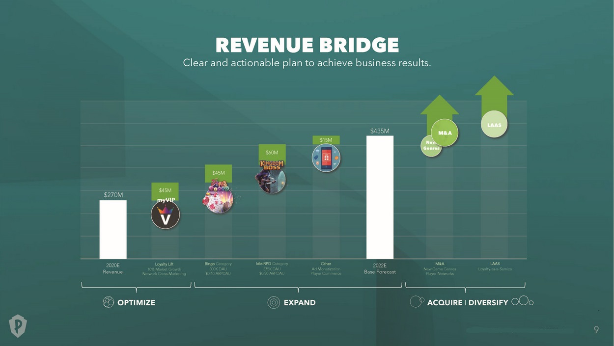 REVENUE BRIDGE Clear and actionable plan to achieve business results. Loyalty Lift 10% Market Growth Network Cross - Marketing Bingo Category 300K DAU $0.40 ARPDAU Idle RPG Category 375K DAU $0.50 ARPDAU $270M $435M 2020E Revenue 2022E Base Forecast M&A New Game Genres Player Networks $45M $60M EXPAND O P T I M I Z E Other Ad Monetization Player Commerce $15M ACQUIRE I DIVERSIFY $45M myVIP New G e n r e s L A A S M & A LAAS Loyalty - as - a - Service