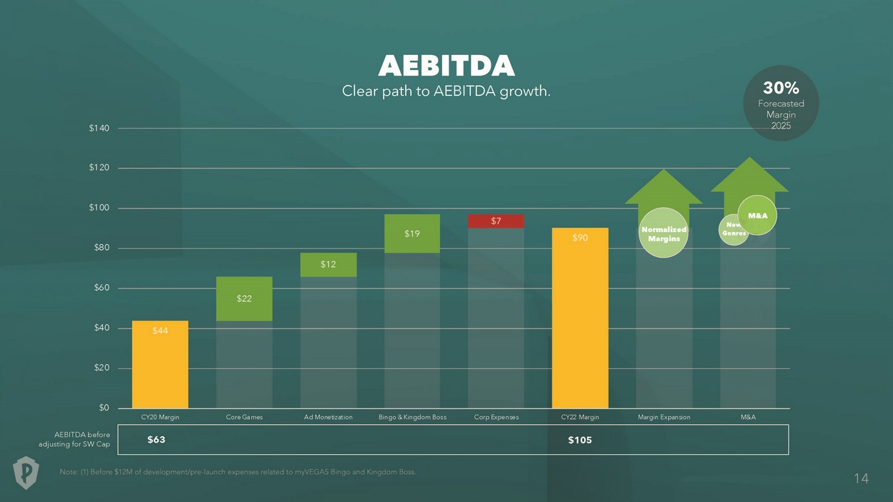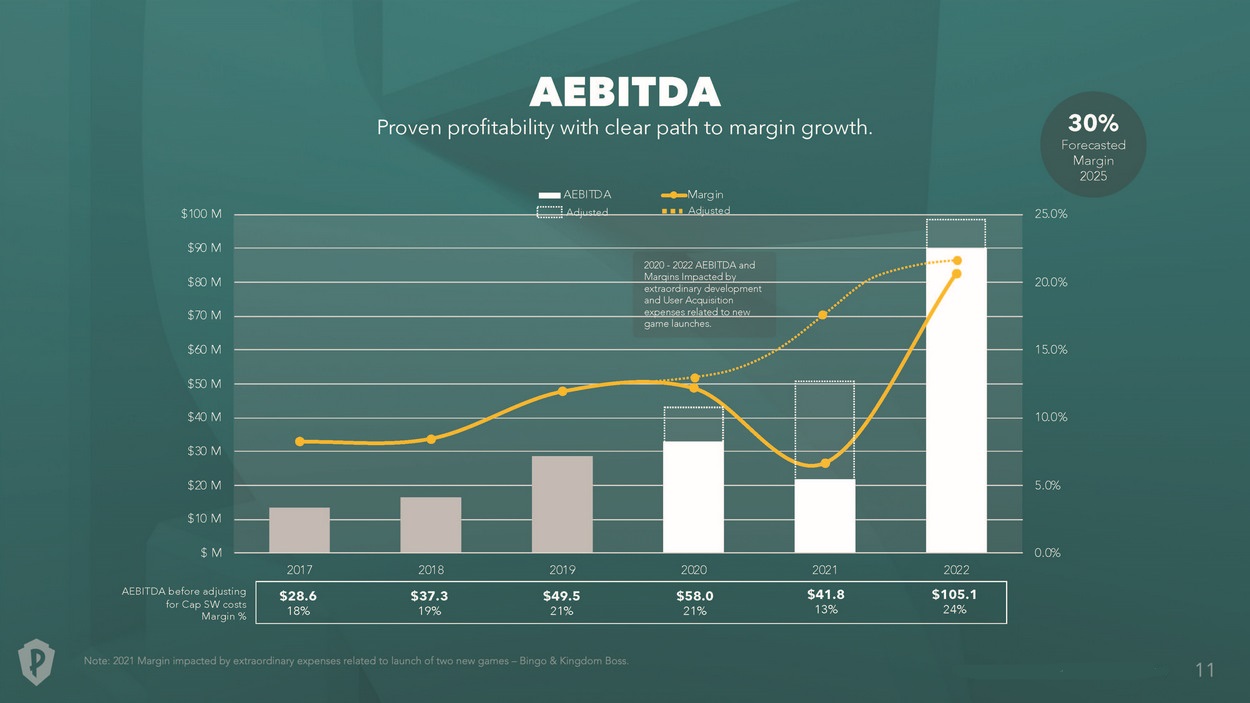 $44 $90 $22 $12 $19 $7 $0 $ 2 0 $ 4 0 $ 6 0 $ 8 0 $ 1 00 $ 1 20 $ 1 40 CY20 Margin Core Games Ad Monetization Bingo & Kingdom Boss Corp Expenses CY22 Margin Margin Expansion M & A A E B I T D A Clear path to AEBITDA growth. Margin 2025 30% Forecasted N or m a l iz e d Margins Genres M & A New AEBITDA before adjusting for SW Cap $63 $105