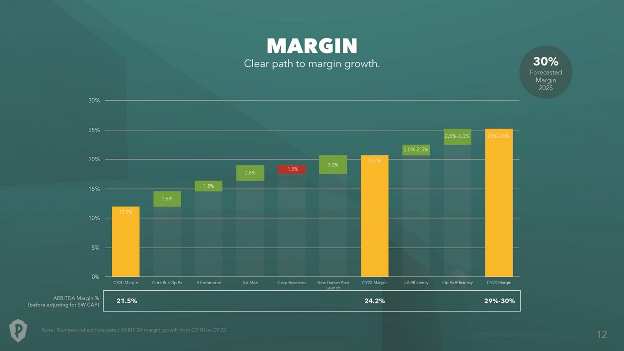 20.7% 2.6% 1.8% 2.6% 1.5% 3.2% 0% 5% 12.0% 10% 1 5 % 2 0 % 2 5 % 3 0 % CY20 Margin Core Bus Op Ex E Commerce Ad Mon Corp Expenses New Games Post Launch CY22 Margin UA Efficiency Op Ex Efficiency CY23 Margin MARGIN Clear path to margin growth. 2.0% - 2.5% 2.5% - 3.0% 25% - 26% 30% F o r ec a s t ed Margin 2025 AEBITDA Margin % (before adjusting for SW CAP) 21 .5 % 24 .2 % 29% - 30%