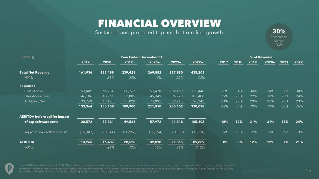 (in 000's) Year Ende d Dec ember 31 % of Revenue 2017 2018 2019 2020e 2021e 2022e 201 7 2018 201 9 2020e Total Net Revenue 161,936 195,499 239,421 269,882 327,980 435,205 YOY% 21% 22% 13% 22% 33% Expenses Cost of Sales 53,409 66 , 784 80,267 91,470 102,169 128,448 33% 34% 34% 34% User Acquisition 46,186 48 , 261 53,805 49,349 94,278 103,408 29% 25% 22% 18% All Other, Net 33 , 76 9 43 , 12 3 55 , 82 8 71,091 89 , 71 5 98 , 24 2 21% 22% 23% 26% 133,364 158 , 168 189,900 211,910 286,162 330,098 82% 81% 79% 79% AEBITDA before adj for impact of cap software costs 28,572 37 , 331 49,521 57,972 41,818 105,108 18% 19% 21% 21% Impact of cap software costs ( 15 , 307 ) ( 20 , 844 ) (20,996) (25,154) ( 20 , 003 ) (15,218) - 9 % - 11% - 9 % - 9 % AEBITDA 13 , 26 5 16 , 48 7 28 , 52 5 32,818 21 , 81 5 89 , 88 9 8% 8% 12% 12% YOY% 24% 73% 15% - 34 % 312% FINANCIAL OVERVIEW Sustained and projected top and bottom - line growth. 30% F o r ec a s t ed Margin 2025