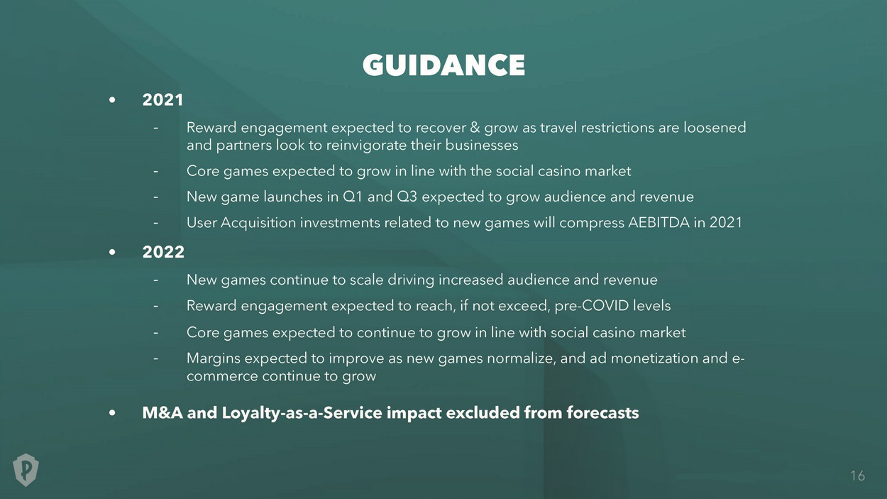 GUIDANCE • 2021 - Reward engagement expected to recover & grow as travel restrictions are loosened and partners look to reinvigorate their businesses - Core games expected to grow in line with the social casino market - New game launches in Q1 and Q3 expected to grow audience and revenue - User Acquisition investments related to new games will compress AEBITDA in 2021 • 2022 - New games continue to scale driving increased audience and revenue - Reward engagement expected to reach, if not exceed, pre - COVID levels - Core games expected to continue to grow in line with social casino market - Margins expected to improve as new games normalize, and ad monetization and e - commerce continue to grow • M&A and Loyalty - as - a - Service impact excluded from forecasts