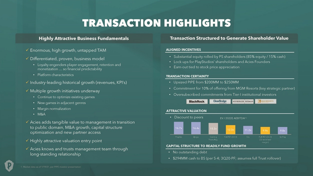 16.7x 16.4x 15.2x 12.3x 11.2x 9.9x 9.8x Pl aytika Z y n g a Gaming Pe ers Avg. PLA YSTUDIOS G l u PLA YSTUDIOS ('23 sta bilized margin ) Sci Play EV / 2022E AEBITDA (1) TRANSACTION HIGHLIGHTS x Enormous, high growth, untapped TAM x Differentiated, proven, business model • Loyalty engenders player engagement, retention and monetization … so financial predictability • Platform characteristics x Industry - leading historical growth (revenues, KPI’s) x Multiple growth initiatives underway • Continue to optimize existing games • New games in adjacent genres • Margin normalization • M&A x Acies adds tangible value to management in transition to public domain, M&A growth, capital structure optimization and new partner access x Highly attractive valuation entry point x Acies knows and trusts management team through long - standing relationship Highly Attractive Business Fundamentals Transaction Structured to Generate Shareholder Value ALIGNED INCENTIVES • Substantial equity rolled by PS shareholders (85% equity / 15% cash) • Lock - ups for PlayStudios’ shareholders and Acies Founders • Earn - out tied to stock price appreciation TRANSACTION CERTAINTY • Upsized PIPE from $200MM to $250MM • Commitment for 10% of offering from MGM Resorts (key strategic partner) • Oversubscribed commitments from Tier - I institutional investors • Discount to peers ATTRACTIVE VALUATION CAPITAL STRUCTURE TO READILY FUND GROWTH • No outstanding debt • $294MM cash to BS (per S - 4; 3Q20 - PF; assumes full Trust rollover)