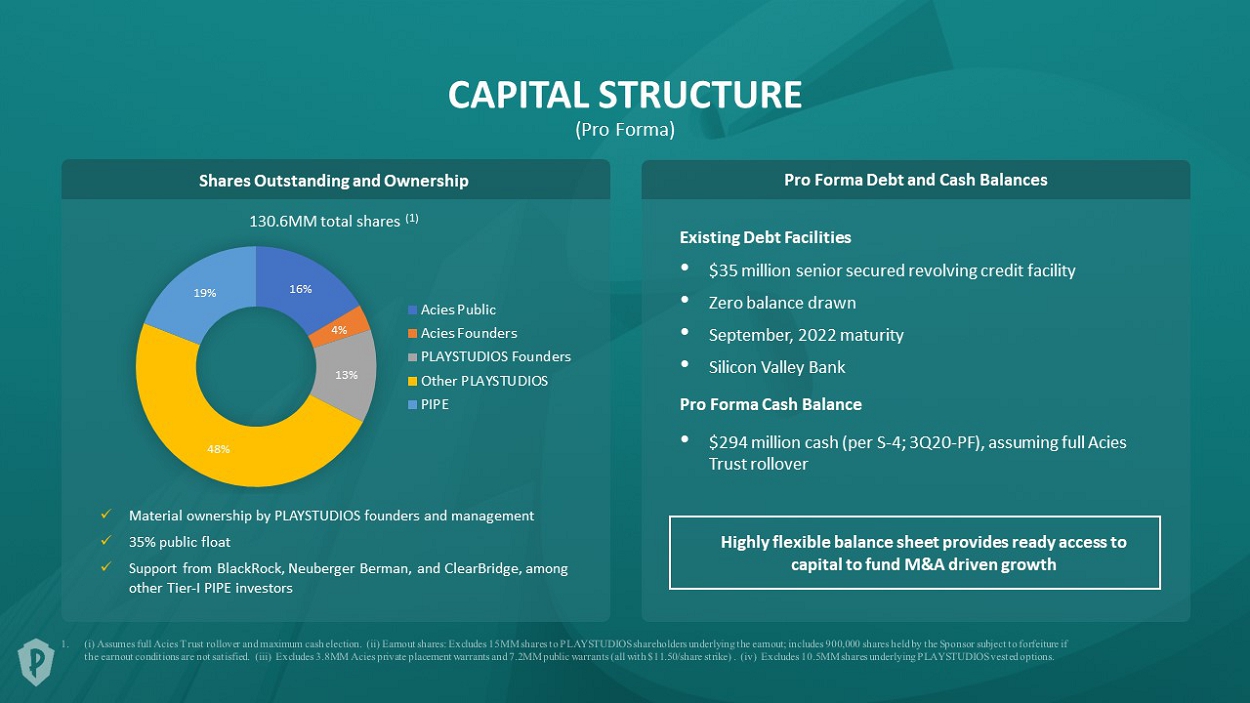 CAPITAL STRUCTURE (Pro Forma) 16% 4% 13% 48% 19% Acies Public Acies Founders PLAYSTUDIOS Founders Other PLAYSTUDIOS PIPE x Material ownership by PLAYSTUDIOS founders and management x 35% public float x Support from Blackrock, Neuberger Berman, and Clearbridge, among other Tier - I PIPE investors Shares Outstanding and Ownership Pro Forma Debt and Cash Balances 130.6MM total shares (1) Existing Debt Facilities • $35 million senior secured revolving credit facility • Zero balance drawn • September, 2022 maturity • Silicon Valley Bank Pro Forma Cash Balance • $294 million cash (per S - 4; 3Q20 - PF), assuming full Acies Trust rollover Highly flexible balance sheet provides ready access to capital to fund M&A driven growth