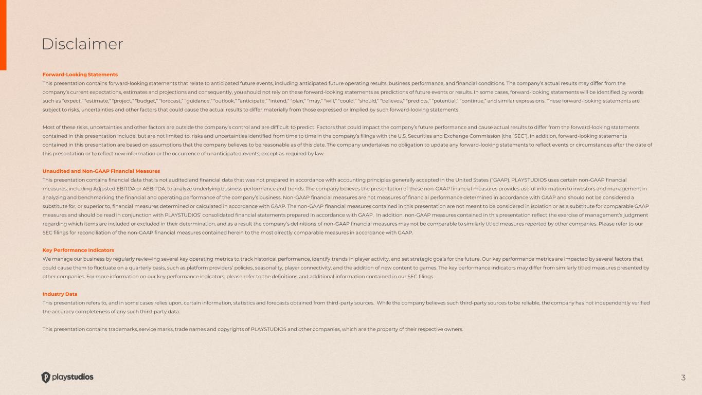 3 Disclaimer Forward-Looking Statements This presentation contains forward-looking statements that relate to anticipated future events, including anticipated future operating results, business performance, and financial conditions. The company’s actual results may differ from the company’s current expectations, estimates and projections and consequently, you should not rely on these forward-looking statements as predictions of future events or results. In some cases, forward-looking statements will be identified by words such as “expect,” “estimate,” “project,” “budget,” “forecast,” “guidance,” “outlook,” “anticipate,” “intend,” “plan,” “may,” “will,” “could,” “should,” “believes,” “predicts,” “potential,” “continue,” and similar expressions. These forward-looking statements are subject to risks, uncertainties and other factors that could cause the actual results to differ materially from those expressed or implied by such forward-looking statements. Most of these risks, uncertainties and other factors are outside the company’s control and are difficult to predict. Factors that could impact the company’s future performance and cause actual results to differ from the forward-looking statements contained in this presentation include, but are not limited to, risks and uncertainties identified from time to time in the company’s filings with the U.S. Securities and Exchange Commission (the “SEC”). In addition, forward-looking statements contained in this presentation are based on assumptions that the company believes to be reasonable as of this date. The company undertakes no obligation to update any forward-looking statements to reflect events or circumstances after the date of this presentation or to reflect new information or the occurrence of unanticipated events, except as required by law. Unaudited and Non-GAAP Financial Measures This presentation contains financial data that is not audited and financial data that was not prepared in accordance with accounting principles generally accepted in the United States (“GAAP). PLAYSTUDIOS uses certain non-GAAP financial measures, including Adjusted EBITDA or AEBITDA, to analyze underlying business performance and trends. The company believes the presentation of these non-GAAP financial measures provides useful information to investors and management in analyzing and benchmarking the financial and operating performance of the company’s business. Non-GAAP financial measures are not measures of financial performance determined in accordance with GAAP and should not be considered a substitute for, or superior to, financial measures determined or calculated in accordance with GAAP. The non-GAAP financial measures contained in this presentation are not meant to be considered in isolation or as a substitute for comparable GAAP measures and should be read in conjunction with PLAYSTUDIOS’ consolidated financial statements prepared in accordance with GAAP. In addition, non-GAAP measures contained in this presentation reflect the exercise of management’s judgment regarding which items are included or excluded in their determination, and as a result the company’s definitions of non-GAAP financial measures may not be comparable to similarly titled measures reported by other companies. Please refer to our SEC filings for reconciliation of the non-GAAP financial measures contained herein to the most directly comparable measures in accordance with GAAP. Key Performance Indicators We manage our business by regularly reviewing several key operating metrics to track historical performance, identify trends in player activity, and set strategic goals for the future. Our key performance metrics are impacted by several factors that could cause them to fluctuate on a quarterly basis, such as platform providers’ policies, seasonality, player connectivity, and the addition of new content to games. The key performance indicators may differ from similarly titled measures presented by other companies. For more information on our key performance indicators, please refer to the definitions and additional information contained in our SEC filings. Industry Data This presentation refers to, and in some cases relies upon, certain information, statistics and forecasts obtained from third-party sources. While the company believes such third-party sources to be reliable, the company has not independently verified the accuracy completeness of any such third-party data. This presentation contains trademarks, service marks, trade names and copyrights of PLAYSTUDIOS and other companies, which are the property of their respective owners.
