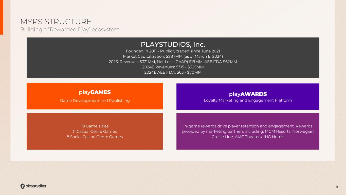 5 Key Investment Highlights PLAYSTUDIOS at-a-glance Rapidly Diversifying Game Portfolio Brainium and Tetris are diversifying revenue streams to faster growing and higher margin casual gaming segment. playAWARDS Platform a Key Differentiator Proprietary loyalty program creates value for players, publishers, and global brand partners. Preparing to externalize platform in 2024 to third party developers and strategic business partners. Strong Leadership with Aligned Interests Numerous executives and board members are among the largest shareholders. CEO is 3rd largest shareholder. Sustained Growth and Strong Capital Position Double-digit, 10-year CAGR. Cash generative business with ~$133MM on hand, as of 12/31/2023. $50MM share repurchase authorization availability. $81MM available revolving credit line. Building a Tetris Franchise Looking to develop and release 1-2 new Tetris games this year and continue adding to library thereafter. Believe Tetris can be a core gaming franchise for MYPS.
