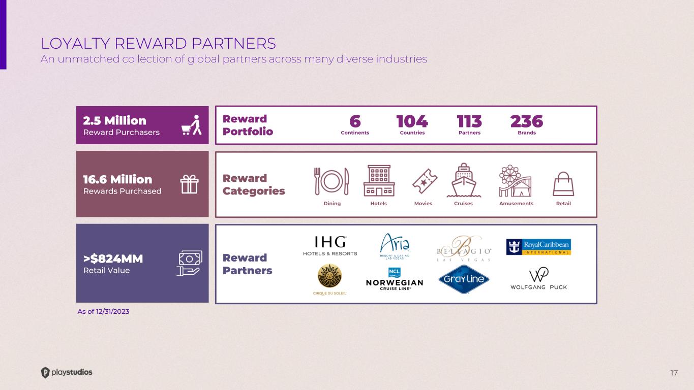 17 Reward Partners 2.5 Million Reward Purchasers >$824MM Retail Value Reward Portfolio Reward Categories 16.6 Million Rewards Purchased 6 Continents 104 Countries 113 Partners 236 Brands Dining Hotels Movies Cruises Amusements Retail As of 12/31/2023 LOYALTY REWARD PARTNERS An unmatched collection of global partners across many diverse industries
