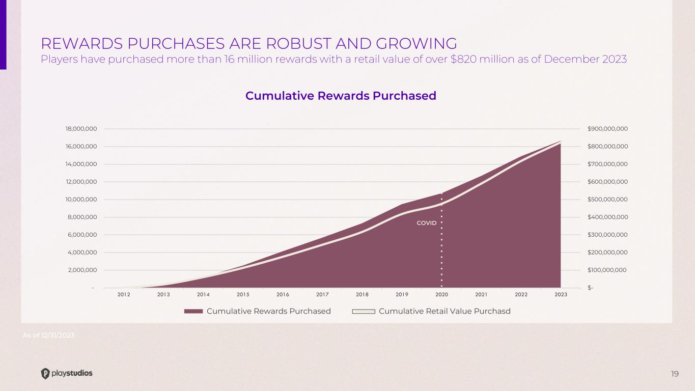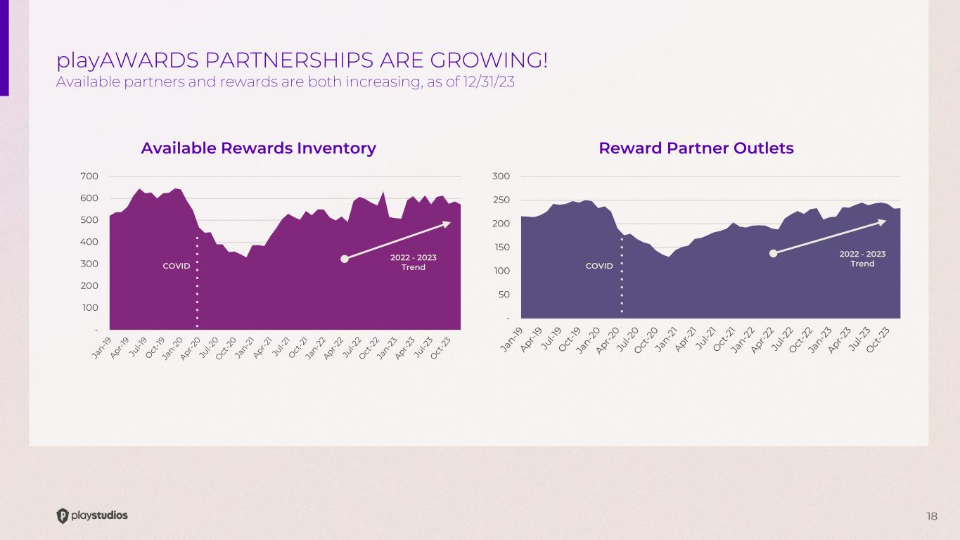 18 - 100 200 300 400 500 600 700 - 50 100 150 200 250 300 Available Rewards Inventory Reward Partner Outlets COVID COVID 2022 - 2023 Trend 2022 - 2023 Trend playAWARDS PARTNERSHIPS ARE GROWING! Available partners and rewards are both increasing, as of 12/31/23