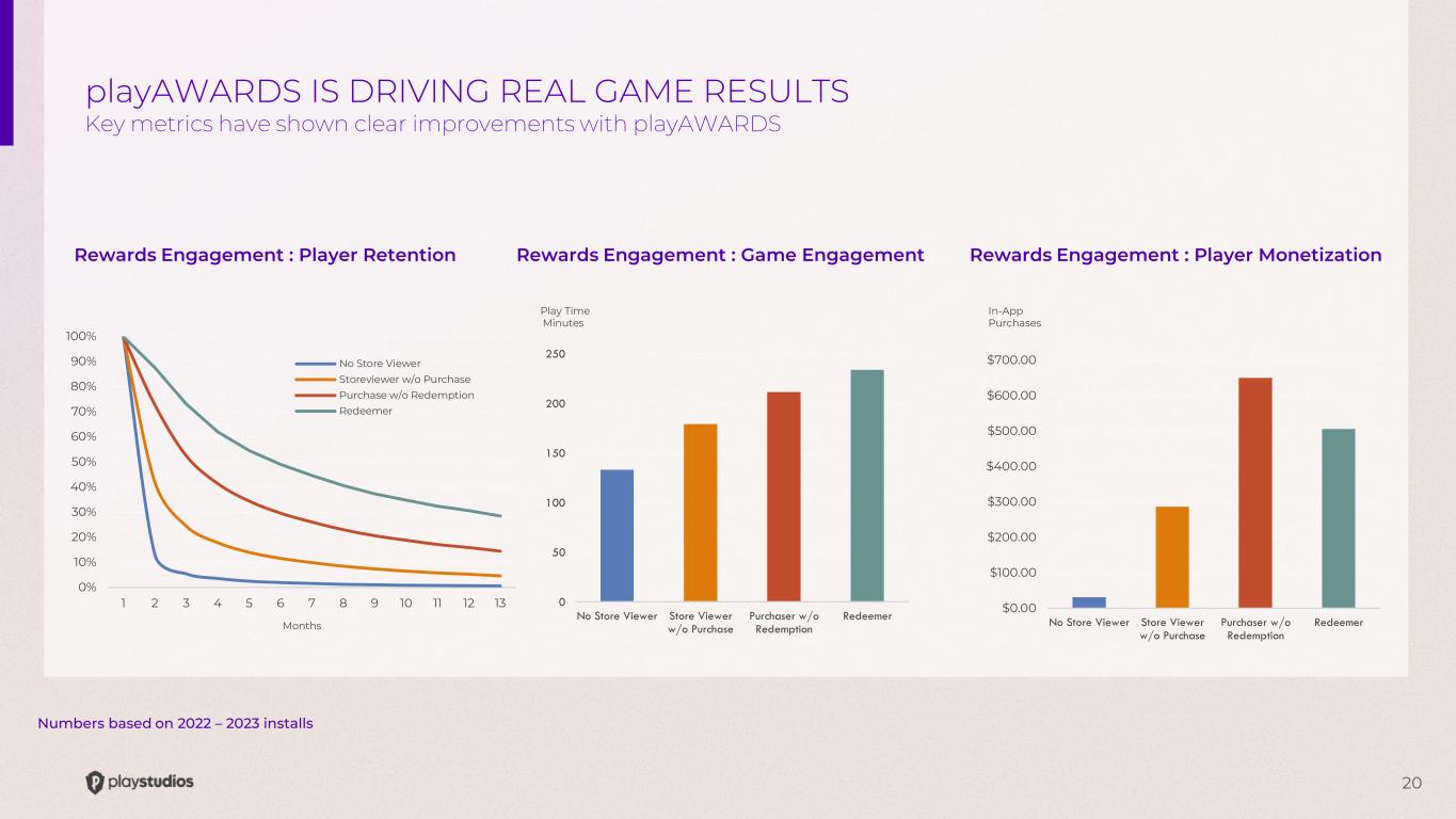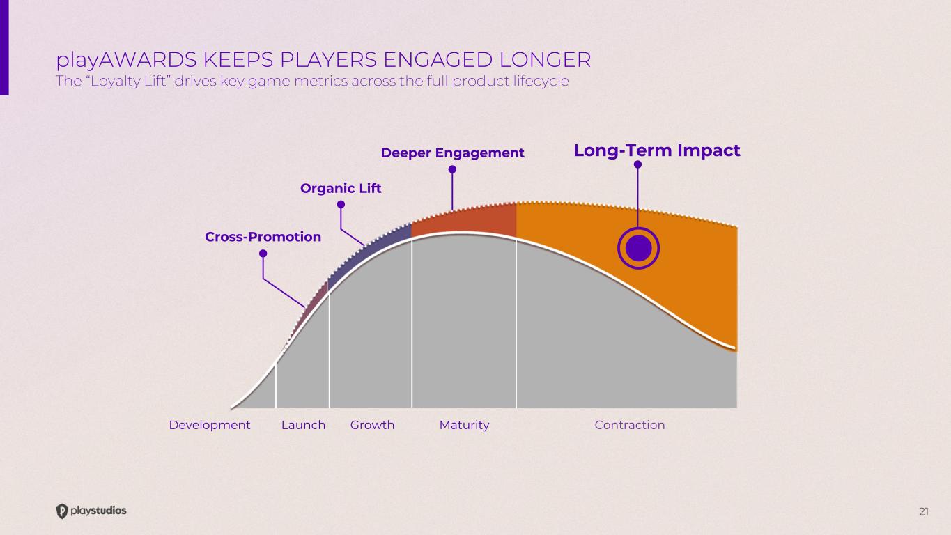 20 Numbers based on 2022 – 2023 installs playAWARDS IS DRIVING REAL GAME RESULTS Key metrics have shown clear improvements with playAWARDS Rewards Engagement : Player Retention Rewards Engagement : Game Engagement Play Time Minutes Rewards Engagement : Player Monetization In-App Purchases Months 0% 10% 20% 30% 40% 50% 60% 70% 80% 90% 100% 1 2 3 4 5 6 7 8 9 10 11 12 13 No Store Viewer Storeviewer w/o Purchase Purchase w/o Redemption Redeemer $0.00 $100.00 $200.00 $300.00 $400.00 $500.00 $600.00 $700.00 No Store Viewer Store Viewer w/o Purchase Purchaser w/o Redemption Redeemer 0 50 100 150 200 250 No Store Viewer Store Viewer w/o Purchase Purchaser w/o Redemption Redeemer
